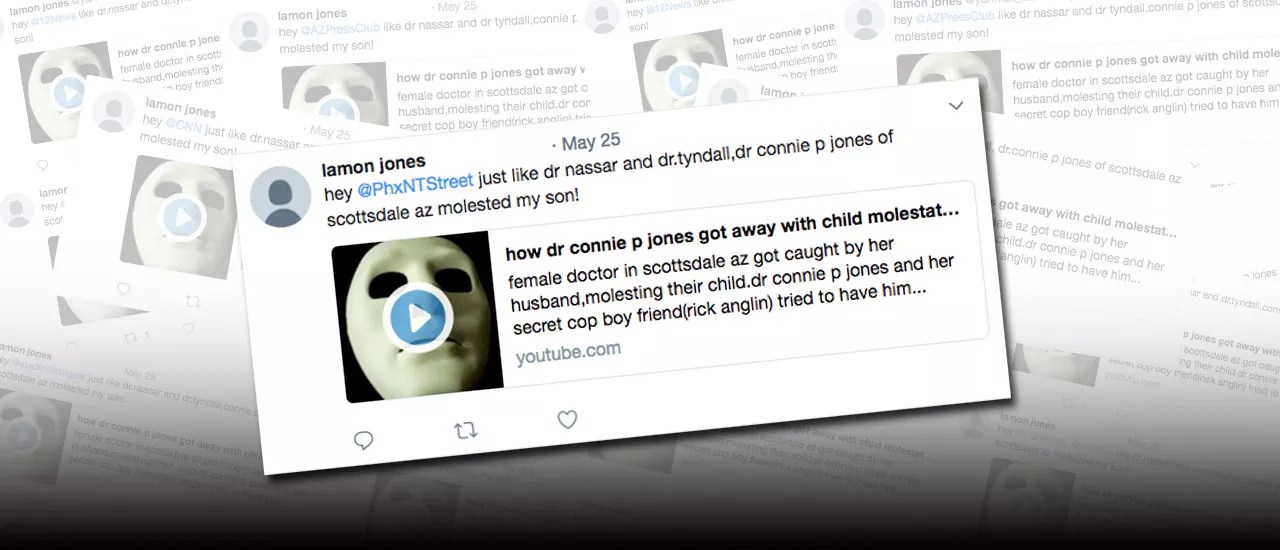 “hey @cbs5investigate just like dr.nassar and dr.tyndall,connie p jones of scottsdale az molested my son!” Jones wrote, in one of many tweets he sent on May 25.