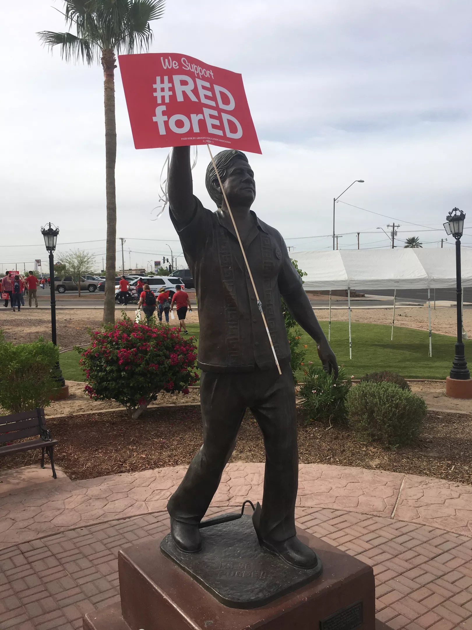 Early on Thursday morning, as a statewide teacher strike began, more than 200 teachers, parents, and students gathered around the statue of Cesar Chavez that serves as an unofficial town center in San Luis, Arizona.