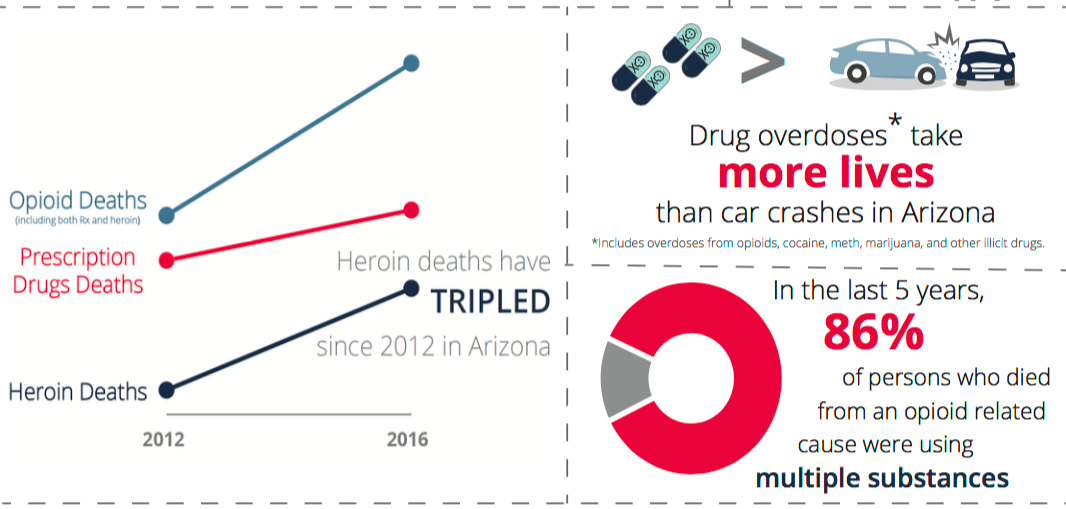 The statistics cited in the announcement are alarming: According to data from the Arizona Department of Health Services, there were 790 deaths resulting from opioid use in 2016, which averages out to two per day. That represents a 74 percent increase since 2012.