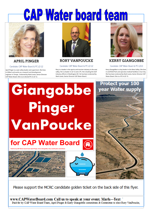 The CAP board, at least nominally, is nonpartisan, yet the Republican Party played a major role in Pinger’s campaign. She ran on a slate with two other Republican candidates, Rory Van Poucke and Kerry Giangobbe, and was supported by numerous local Republican clubs. Lewis ran their campaign, she said. Lewis was the sole dissenting vote among CAP board members in 2017 on a legislative bill to make the CAWCD partisan.