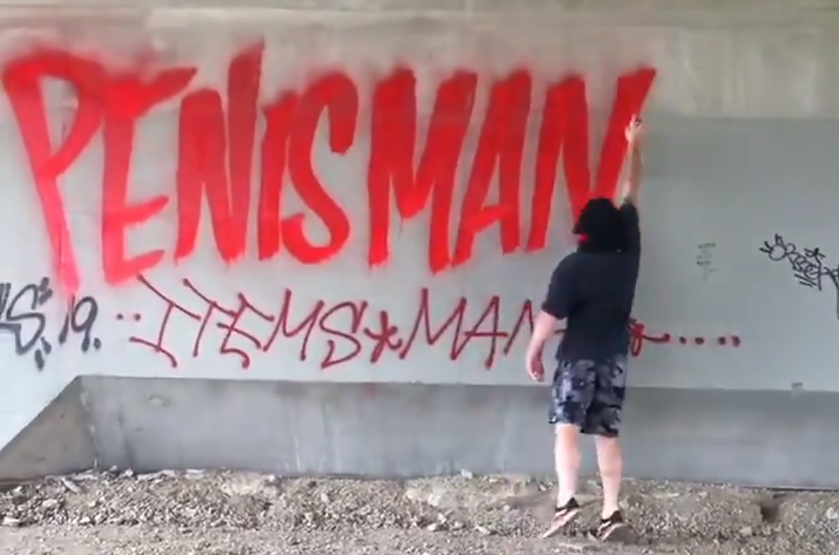 In this screenshot of a Twitter video posted by @Lushsux on Feb. 11, 2020, a man spray paints “Penis Man” on a wall. It’s unclear when or where the video was taken.