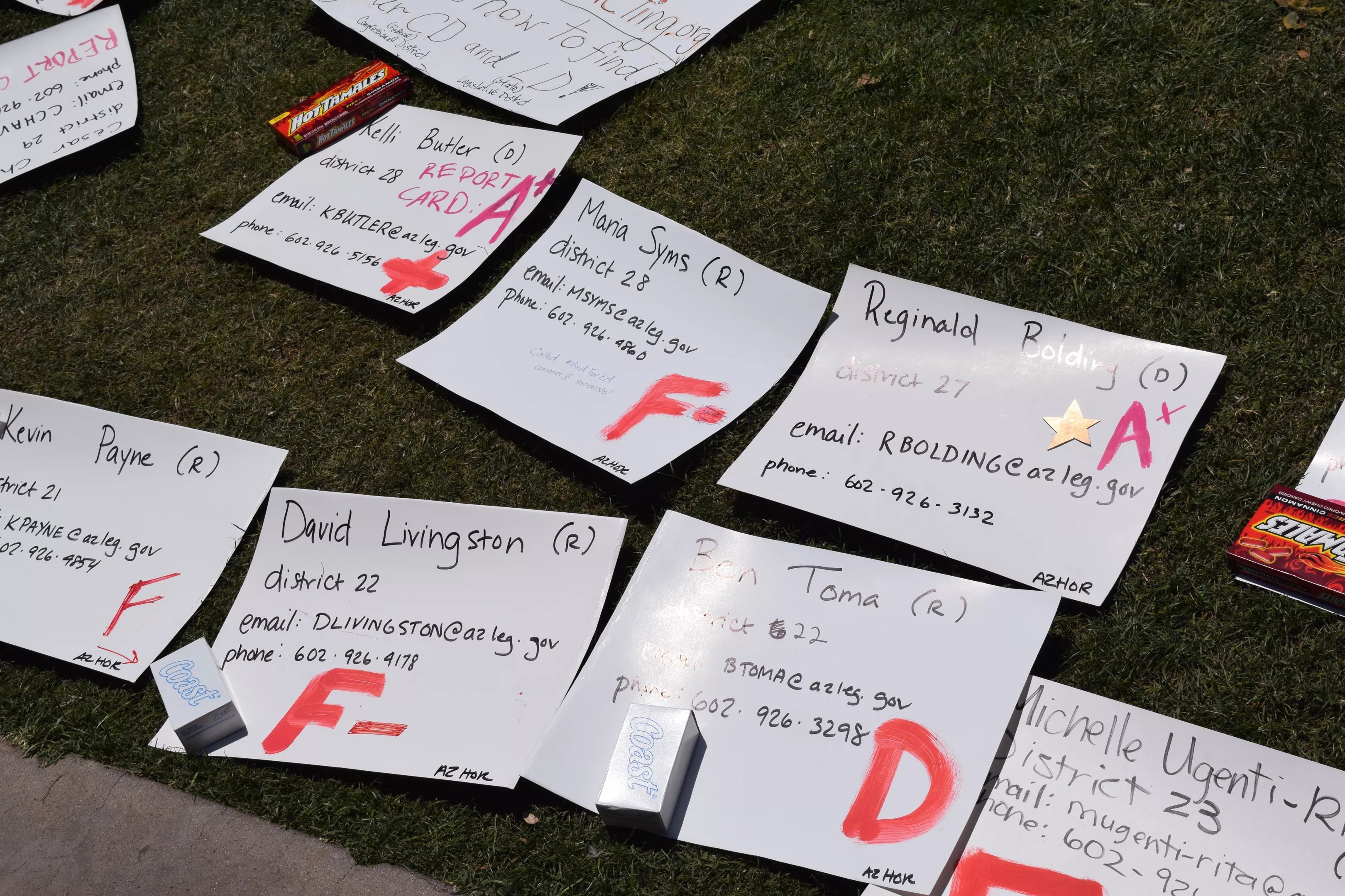 Teachers issued “report cards” to legislators based on their stance on school funding and teacher pay.