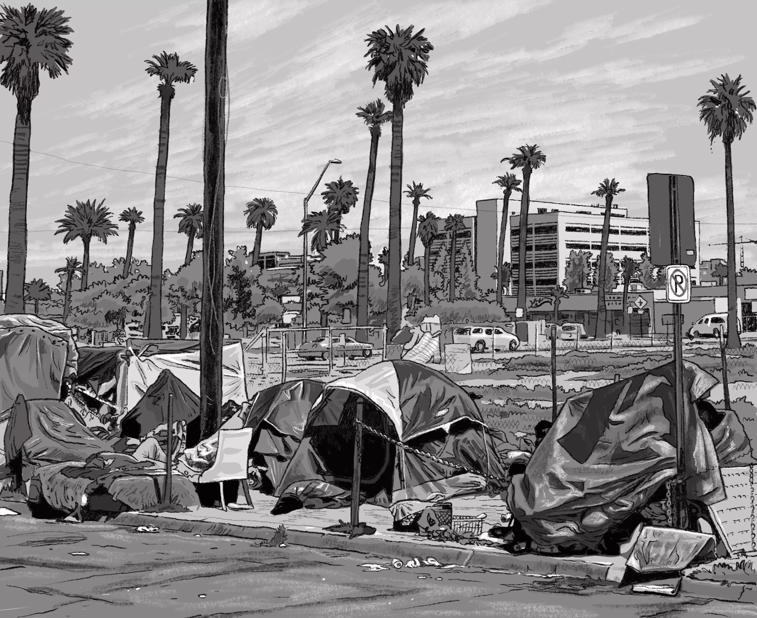 But if violence didn’t come for the unsheltered, the record-setting heat certainly did. Makeshift tents and a lack of air conditioning were scarcely enough to survive in a place that reached 110 degrees for 31 straight days in July. Air conditioning reportedly was down at CASS, Phoenix’s largest shelter, on days when the temperature reached 118 degrees.