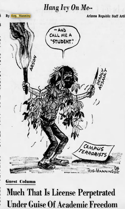 Pulliam’s political cartoonist, Reg Manning, recently had dehumanized the student activists in ink as “campus terrorists,” depicting a scruffy character with a torch in one hand and a bloody knife in the other beneath the words, “Hang ivy on me and call me a student.”