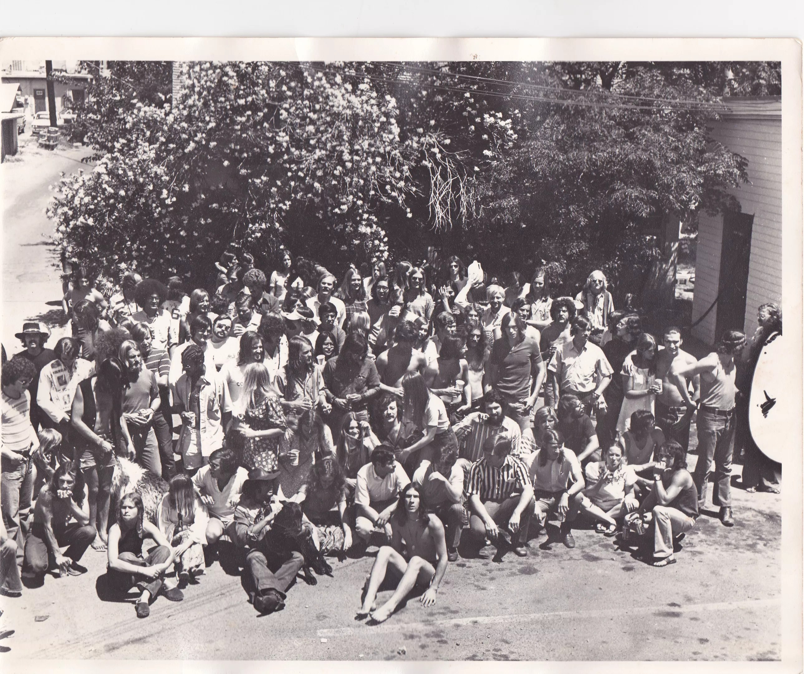 New Times staff, friends, and assorted revelers at its one-year anniversary party in 1971, including a seated, long-haired Mike Lacey, in the center of the second full row.