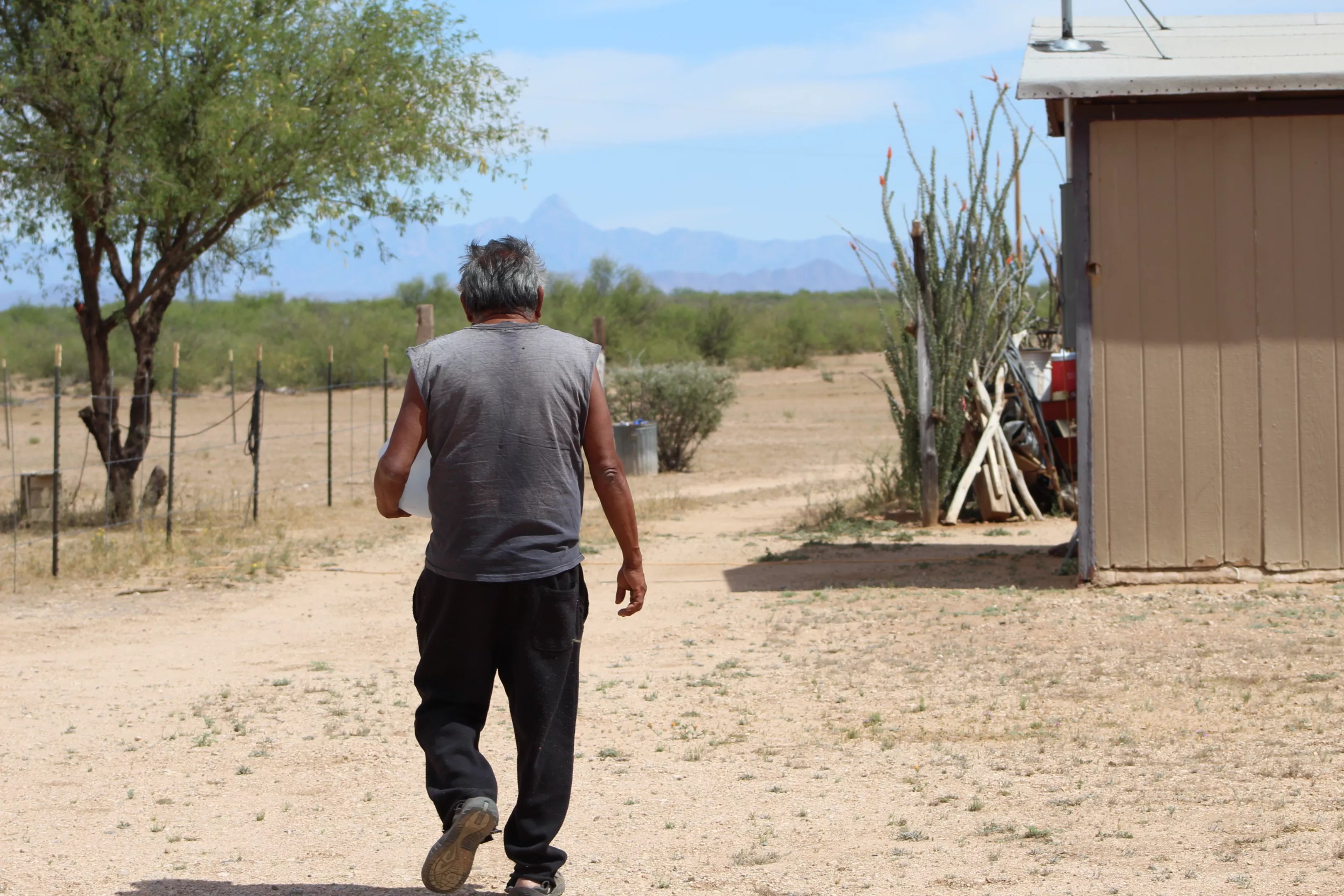 “I’ve lived in towns before – I’d rather be here,” said a middle-aged O’odham man sitting with a woman on a porch bench on a Monday afternoon in April.