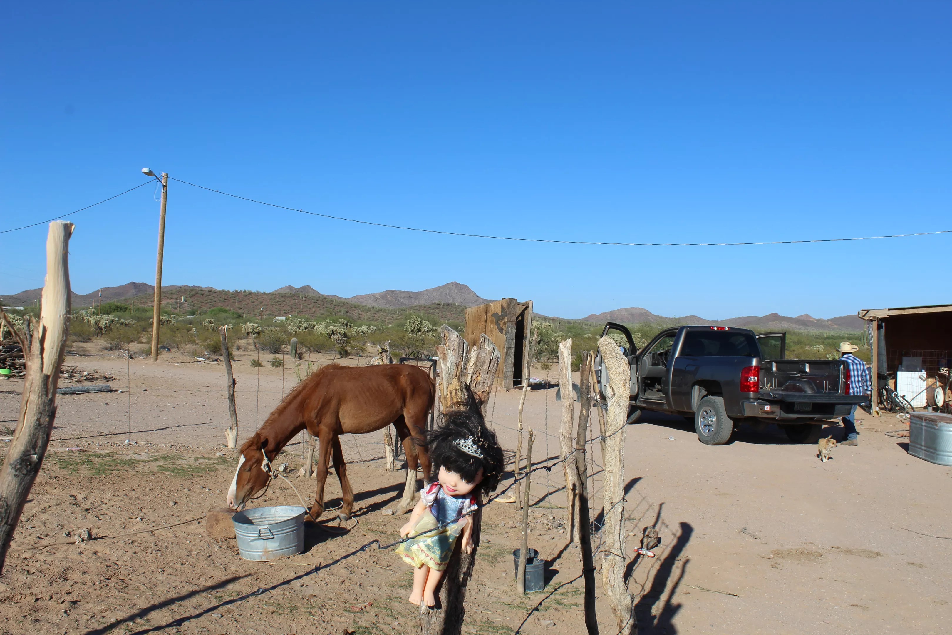 Their property in Gu Oidak – also known by its English name, Big Field – is in the reservation’s south-central area. The half-dozen homes and cemetery in the vicinity are surrounded by miles of rolling desert plains and arroyos, often covered in a fine sand locals call “moon dust.”