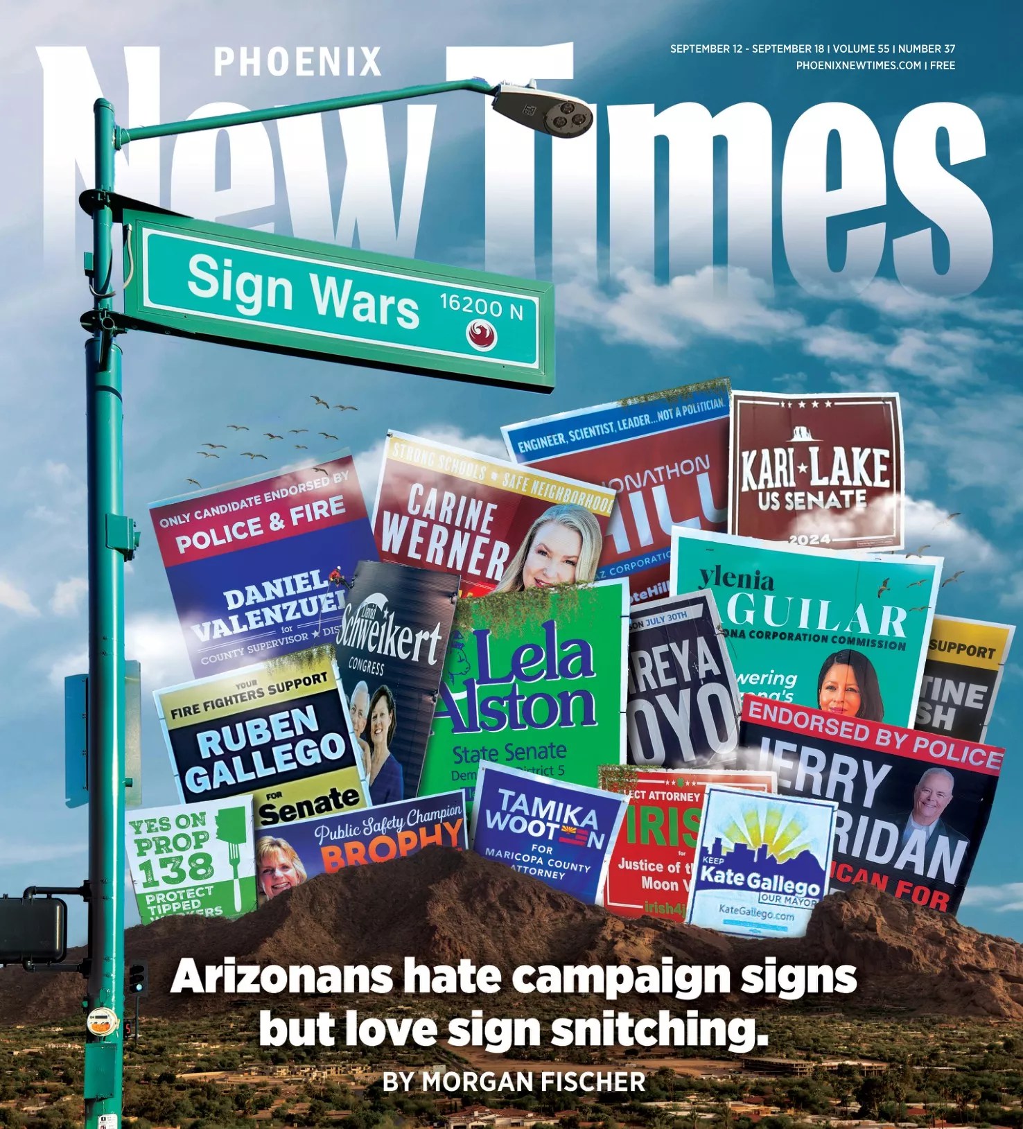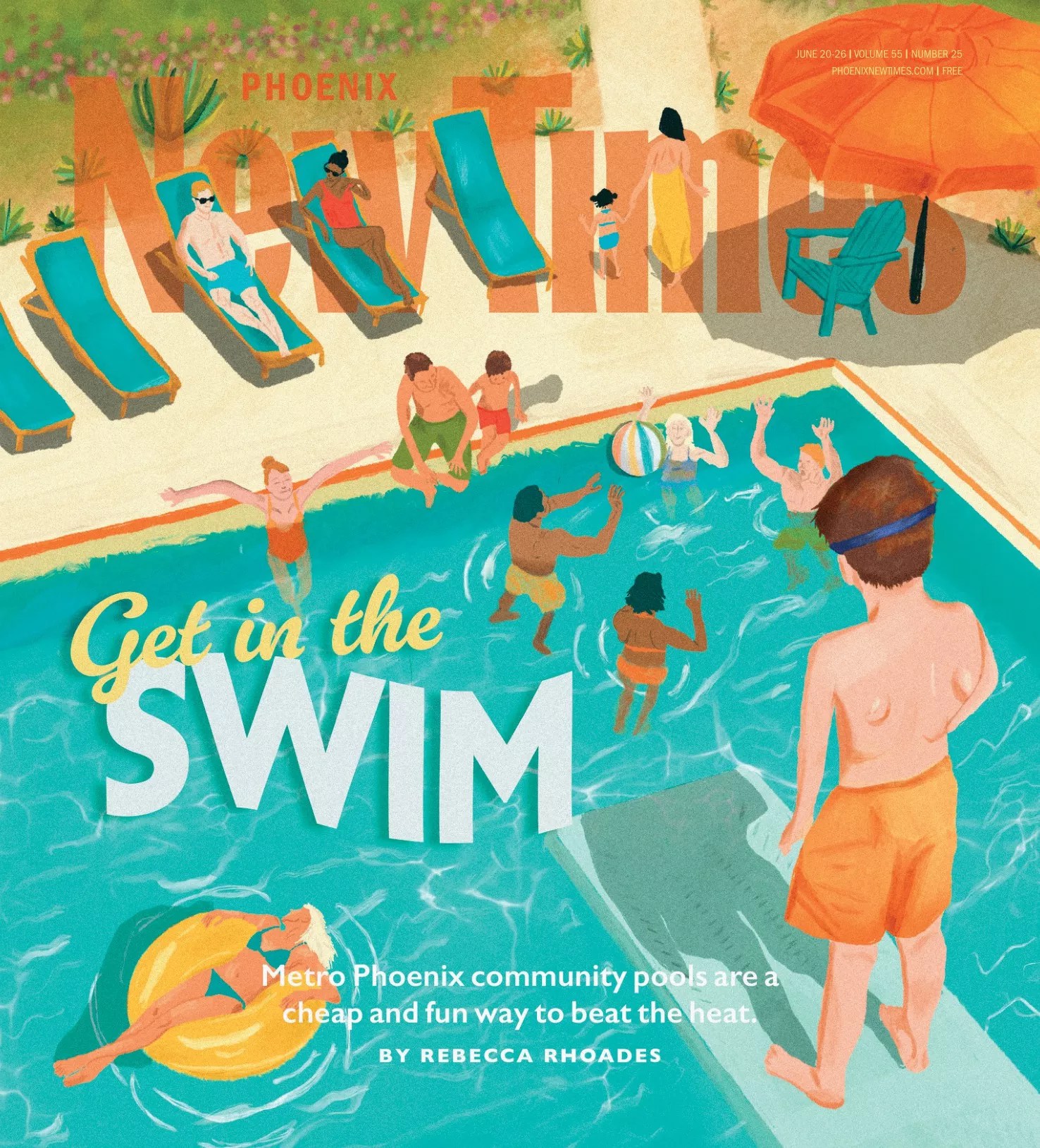 Illustration by Emma Randall “It’s just a really bright, summery cover. I also love the angle of the boy on the diving board looking down at the pool.” – Jennifer Goldberg, culture and music editor Illustration by Emma Randall “Normally, Top 100 lists use photos of a dish or a drink. This illustration lets me know that the topic is bars but doesn’t favor any one destination. Plus, so many bars and lounges have retro vibes and serve riffs on classic cocktails, and the midcentury modern artwork reflects that attitude. Plus, it’s just fun!” – Rebecca Rhoades, copy editor Illustration by Eric Torres “It’s a very creative Phoenix cover with the political signs coming out of Camelback Mountain. I love the detail of the story’s title being printed on a Phoenix street sign. Also, the little detail of a construction worker climbing one of the signs is great.” – Morgan Fischer, staff writer Illustration by Mark Poutenis “It’s cartoony without being over-the-top, fun and grabs your attention.” – Benjamin Leatherman, staff writer