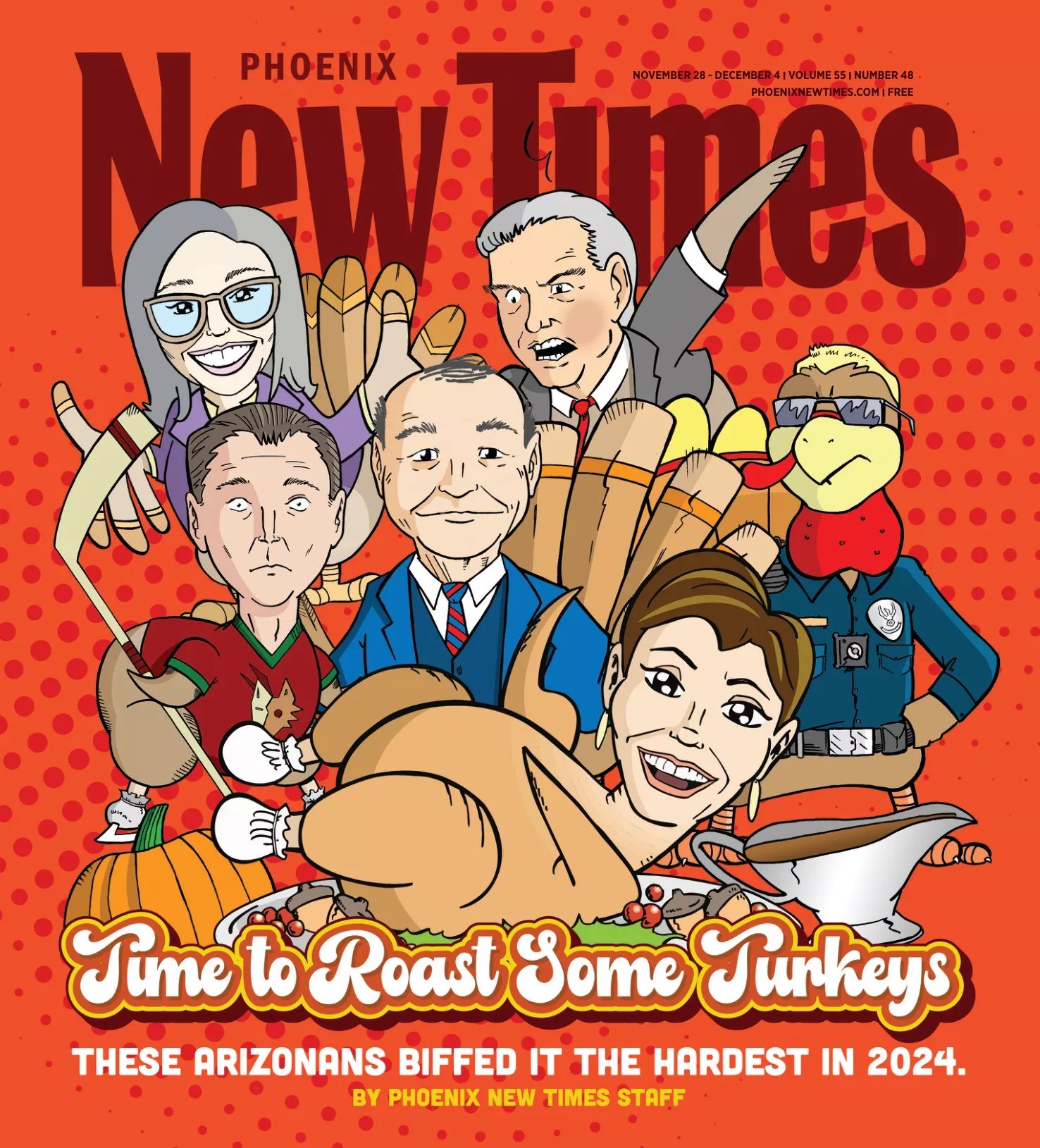 Illustration by Richard Borge “The three-dimensionality of this cover is really inviting and interesting. Plus, it perfectly captures the hustle and bustle of building that’s going on as the Valley grows.” – Zach Buchanan, news editor Illustration by Chas Coffman “The cover is so quirky and funny and draws you into an interesting, quirky world of these women.” – Sara Crocker, food writer Illustration by Russ Kazmierczak, Jr. “The turkeys are a tender masterpiece, each bursting with savory flavor. The golden skin is perfectly crisped on each honoree by artist Russ Kazmierczak.” – Eric Torres, art director Illustration by Eric Torres “I’m a (completely biased) fan of the Best New Restaurants cover. Not only does it display dishes from restaurants all over the Valley, but our creative art director Eric Torres made the Phoenix New Times logo out of Sriracha.” – Tirion Boan, food editorJune 13: A Progressive Primary Showdown