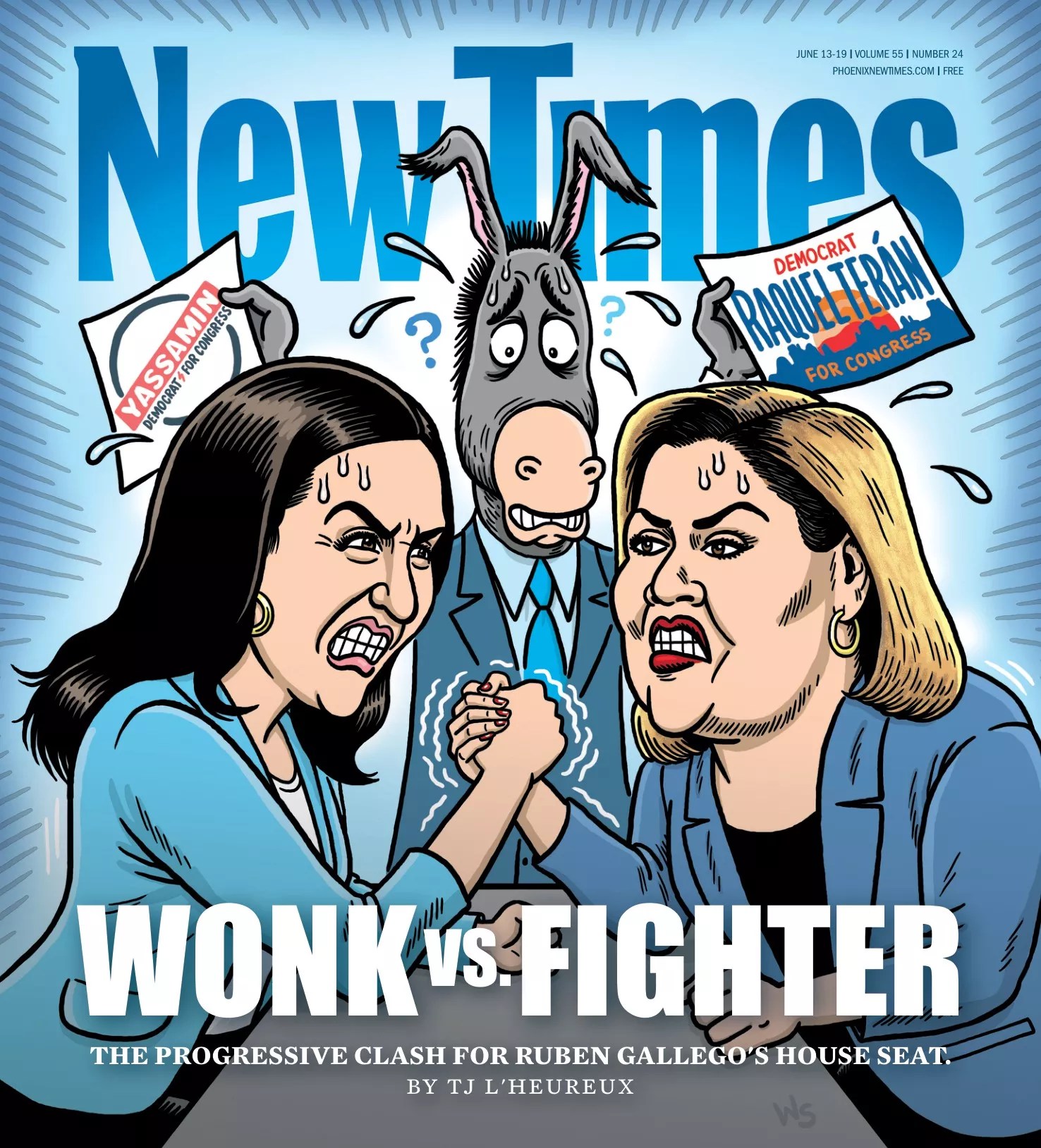 “I absolutely love the art style, the colors and how the nameplate is resting on a shelf. The drawings of the people really convey the community aspect of the bookstore and how people bond over the selections.” Itzia Crespo, social media editor Illustration by Ward Sutton “Out of the roughly 38,000 votes cast in the Democratic primary to inherit Ruben Gallego’s seat in the House of Representatives, Yassamin Ansari bested Raquel Terán by a mere 39 votes. The cover art illustration by Ward Sutton captures the tension of the race and forecast the nail-biting finish.” – TJ L’Heureux, staff writer