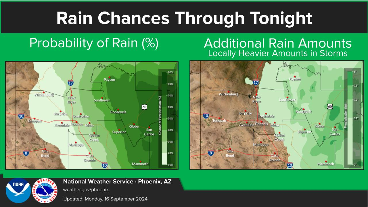 Monday, much of Maricopa County has between a 20-30% chance of rain, according to the National Weather Service. The rainfall could be light – less than 0.1 inches – but points farther east could get heavier rainfall.