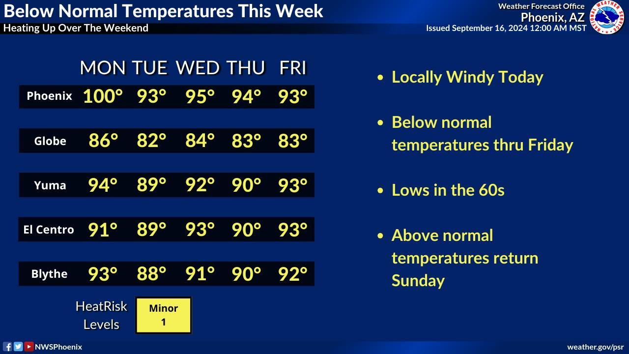 Phoenix is “expecting a lot of cloud cover” and moisture in that stretch, O’Malley said, and the NWS projects highs of 93-95 degrees from Tuesday through Friday. That would be a lower temperature than is normal for this time of year in the Valley. Typically, mid-September still means temperatures above 100 degrees. Even more appealing are the projected lows in the 60s.