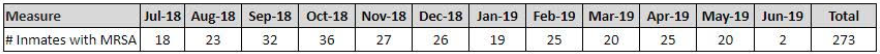 The number of inmates in Arizona prisons being treated for MRSA every month from July 2018 to June 2019.