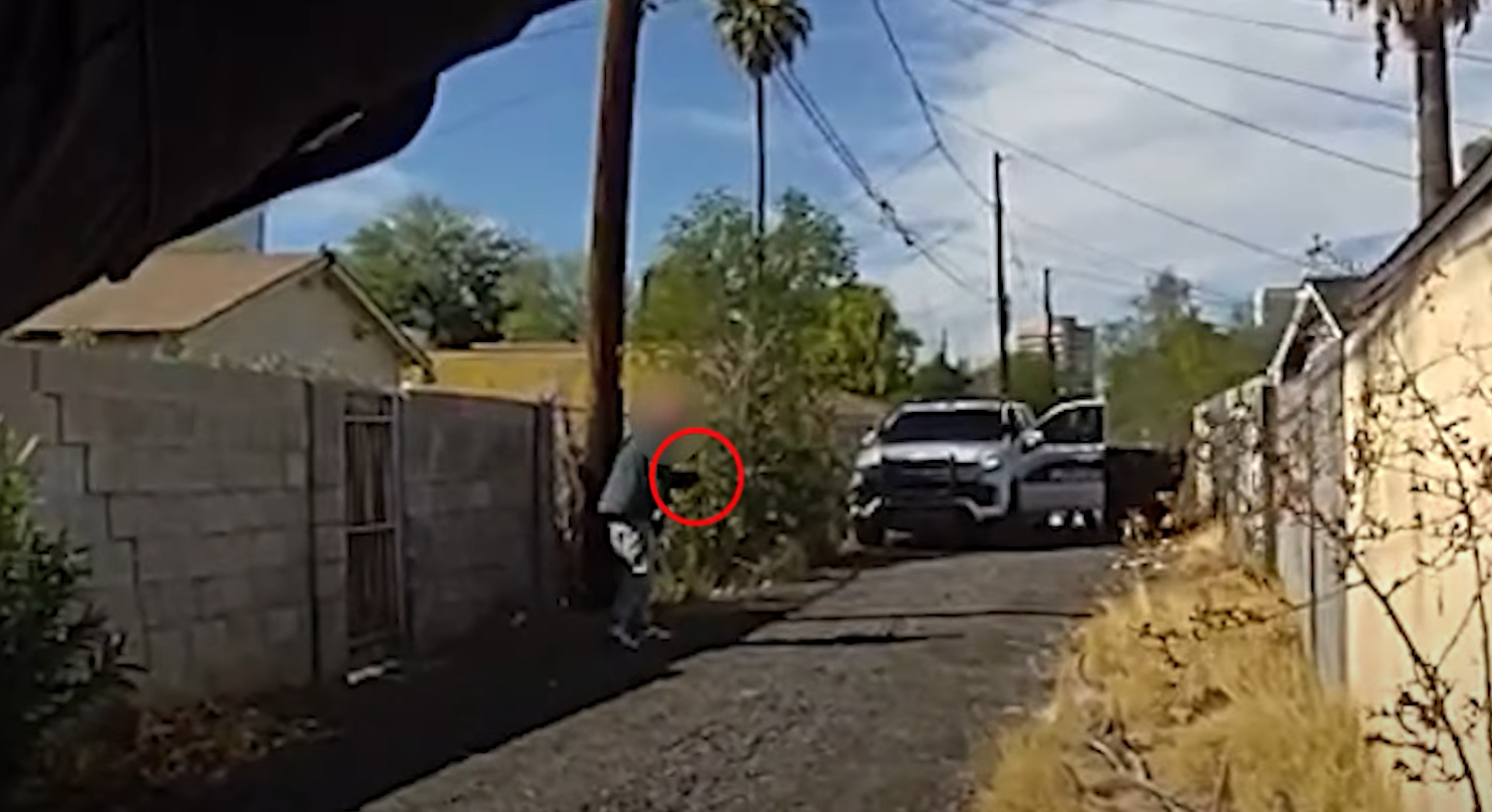 In the briefing, police said Martinez pointed the gun at an officer on the other side of the alley. That officer’s body-cam footage does show something in Martinez’s hand as he removes it from his pocket, while body-cam footage from an officer on the opposite side of the alley appears to show Martinez raising the item in the direction of the first officer, who had taken cover behind the door of his vehicle.