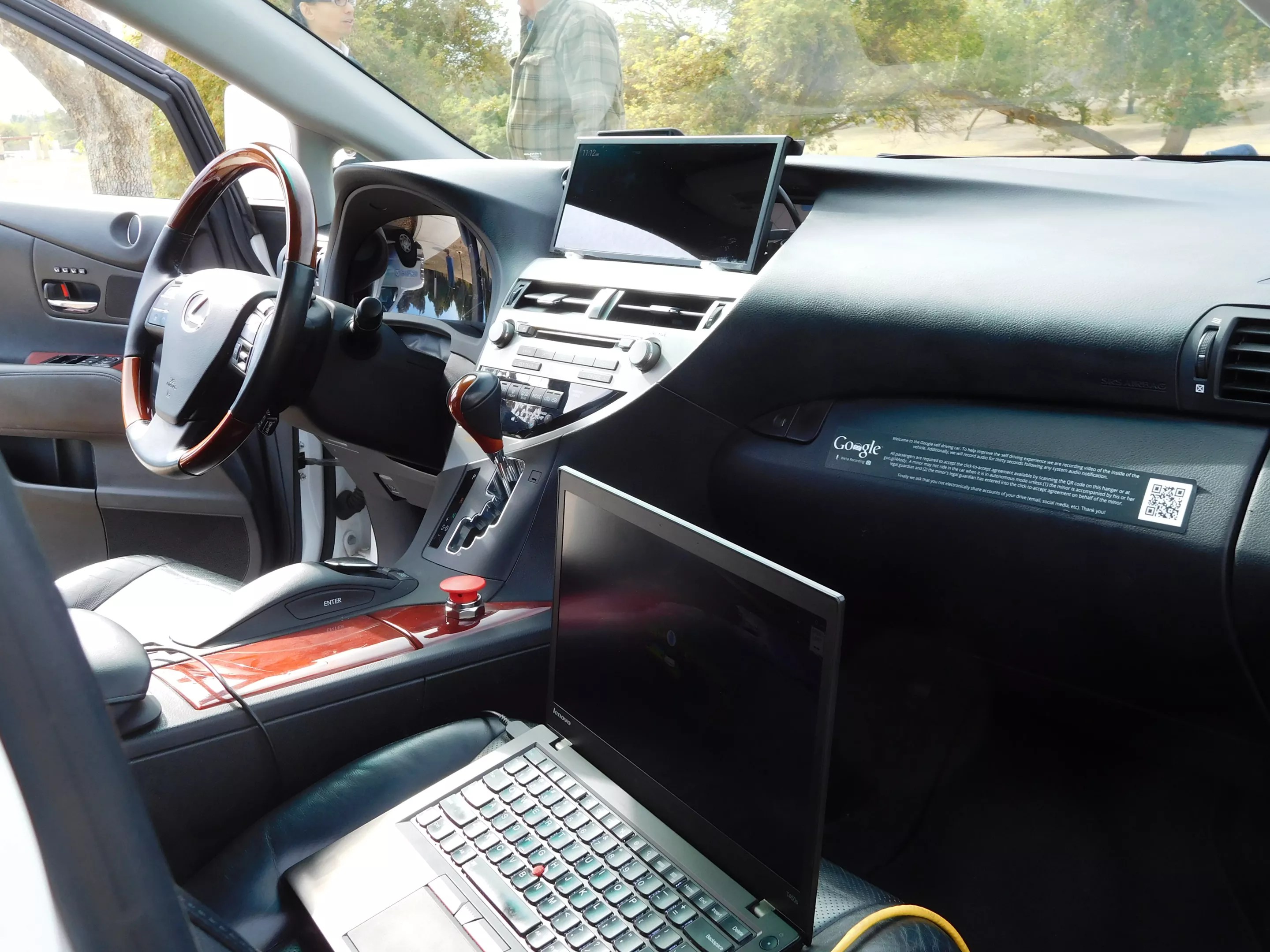 Waymo Lexus interior. The big red button does what you may think – it’s one way to stop the vehicle’s autonomous function.