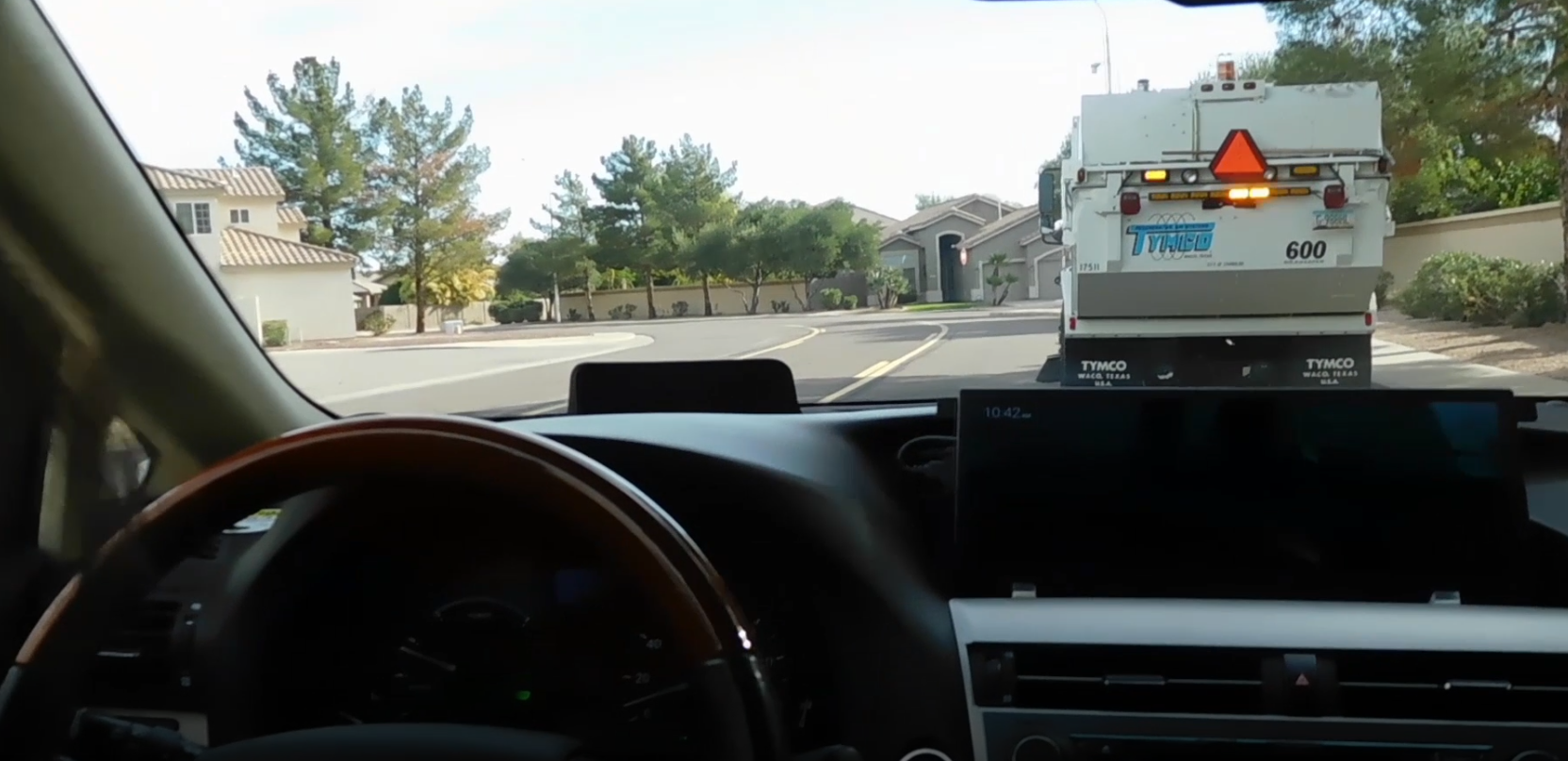 The autonomous Lexus RX450h by Waymo cruised around the mostly-residential area in Chandler like a soccer mom would, stopping at all the stop signs, never exceeding the speed limit, and taking turns gently. Then the perfect driver met its match: a street sweeper.