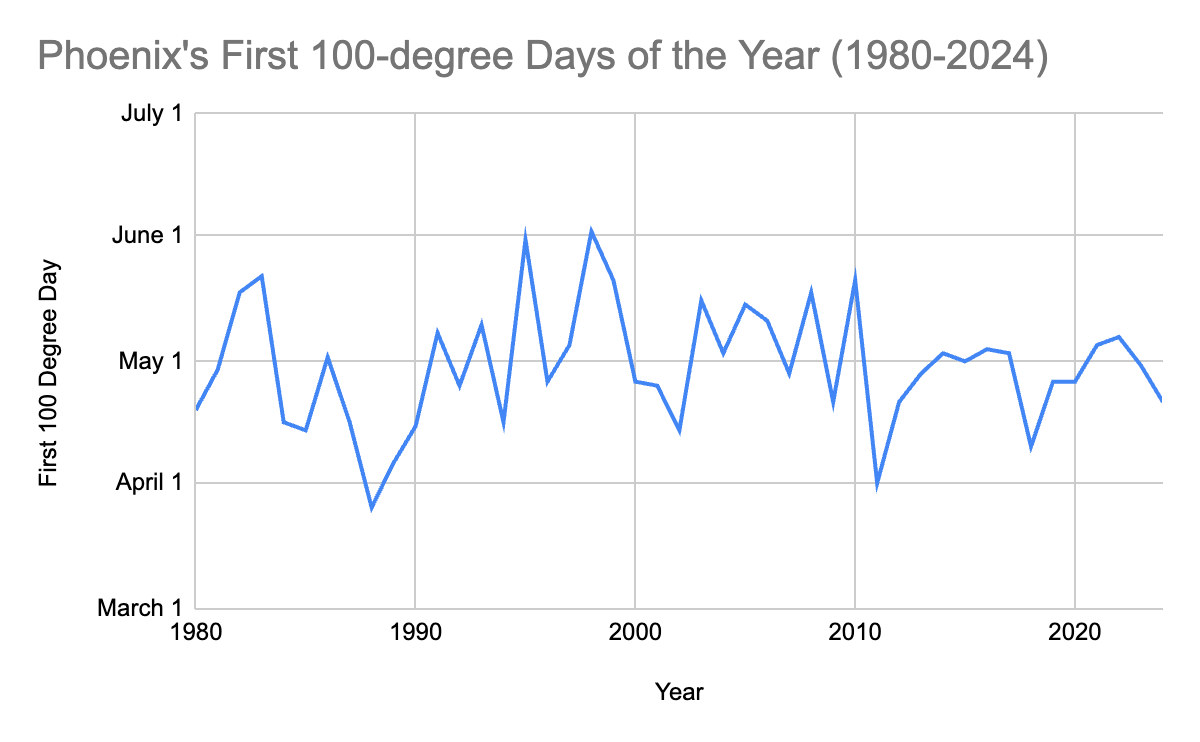 Dating back to 1896, the earliest that Phoenix saw a 100-degree day was in 1988, when the city reached the mark on March 26. Phoenix almost broke that record earlier this month but fell just short, with temperatures reaching 99 degrees on March 25.