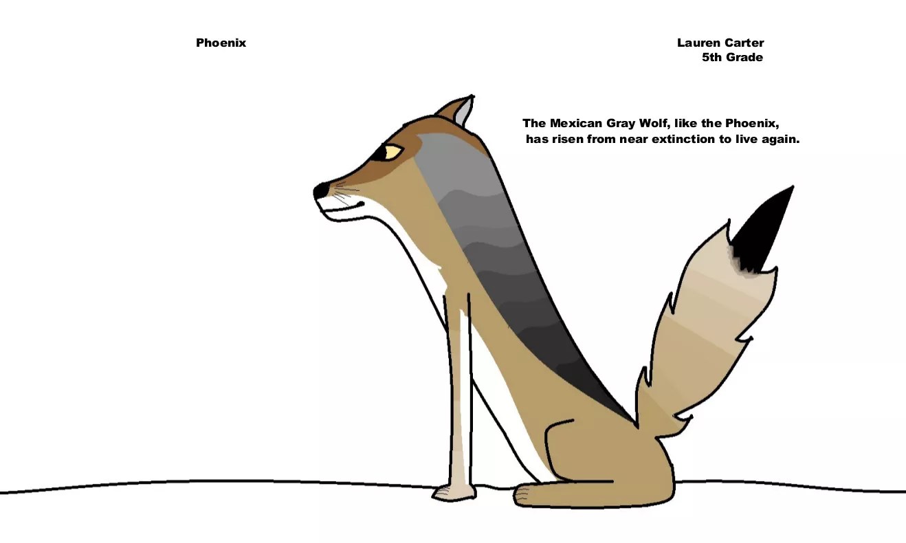 Lauren and Ava, fifth-graders, suggested the name Phoenix in the contest, and a Mexican wolf advocacy group chose their selection when the pup was born in 2015. In her letter, Lauren included a drawing of a smiling Mexican wolf, writing, “The Mexican Gray Wolf, like the Phoenix, has risen from near extinction to live again.”