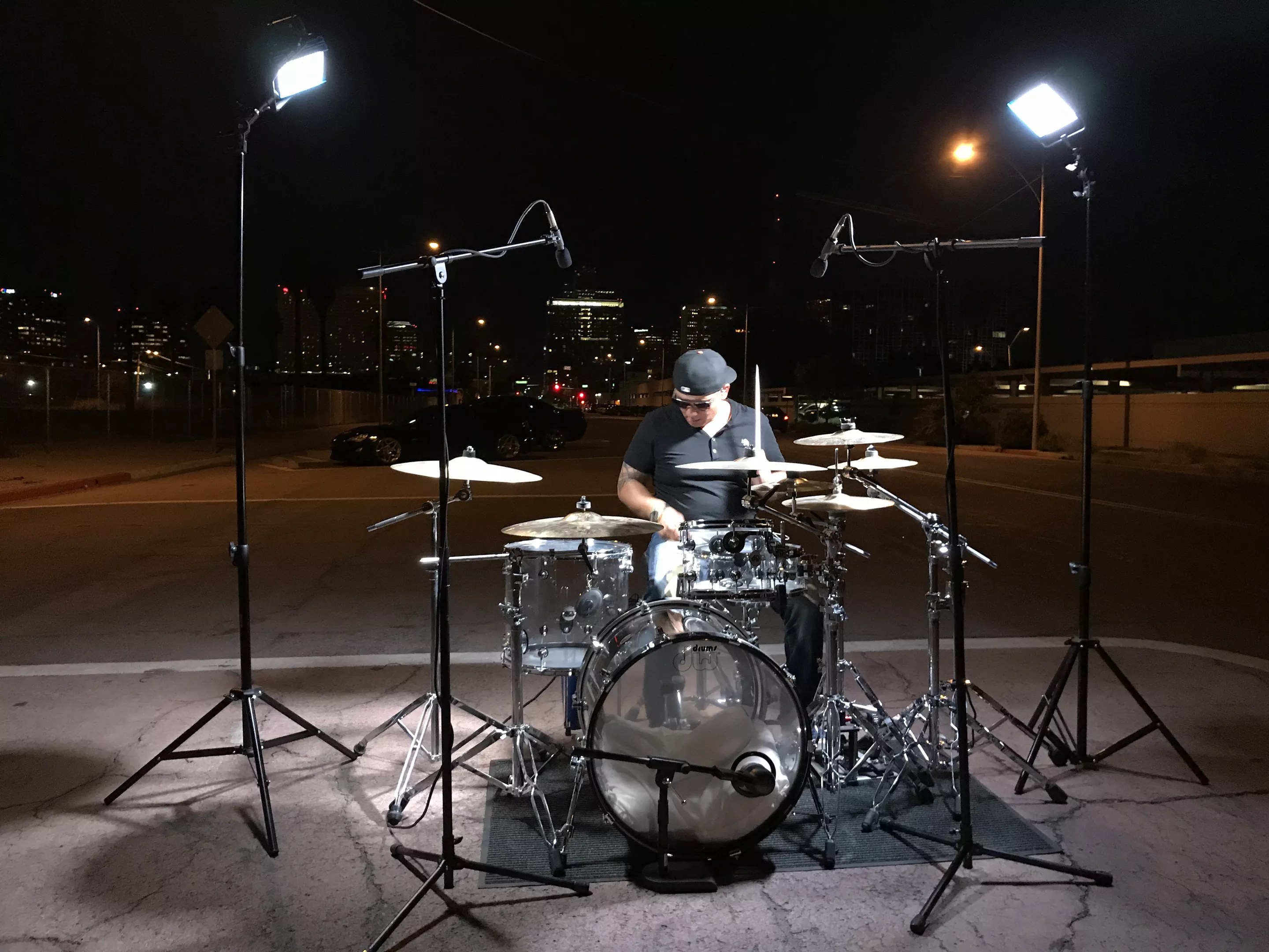 Drummer Gabriel Hererra with the lights of downtown Phoenix behind him