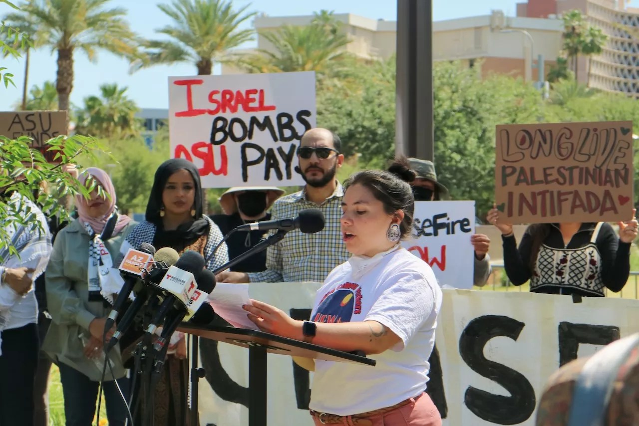 A United College Workers organizer read a statement on Thursday written by ASU students who were arrested and disciplined for protesting Israel’s mass killing of Palestinians.