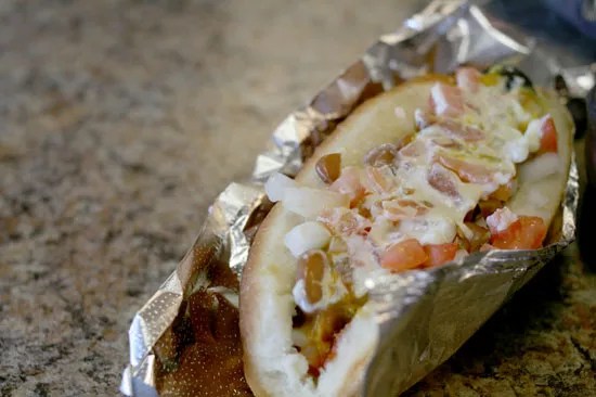 The El Sabroso food truck is an essential eating experience in the Valley. With its large red-and-yellow awning, it’s easy to spot the stand from the road. Admittedly, El Sabroso uses bacon crumbles rather than wrapping the dog, but the generous heaping of toppings ensures a dog bursting at the bolillo with flavor. We suggest pairing the dogs with a cold Mexican Coke or Fanta on hot summer nights.