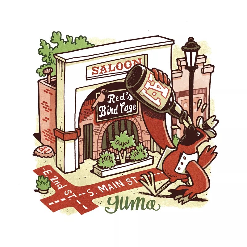 Descend a few steps below street level, notice the old shoeshine chair on the patio, and proceed into the cave-like interior of one of the few local treasures of this sweltering capital of agribusiness. See the photo on the wall of a smiling man surrounded with three lovely young women, looking like Big Daddy in a revival of Cat on a Hot Tin Roof. That’s C.C. “Red” Rambo, the founder, who used to own a place over the California line but moved it here in 1974, turning the former home of the Western Union telegraph office into a Gay Nineties-style pub that the Yuma Daily Sun called “barely respectable,” with a touch of irony. There were blossoms of wrought iron, a 1781 stained-glass window from a British pub, red wallpaper befitting a French bordello, a bar made partly of railroad trestles, regular acts featuring B-list performers from Vegas shows, and a bidet in the women’s room. Red’s has a coating of age on it since the glory days, but C.C.’s widow, Rea, keeps the place going for a hardcore bunch of regulars.