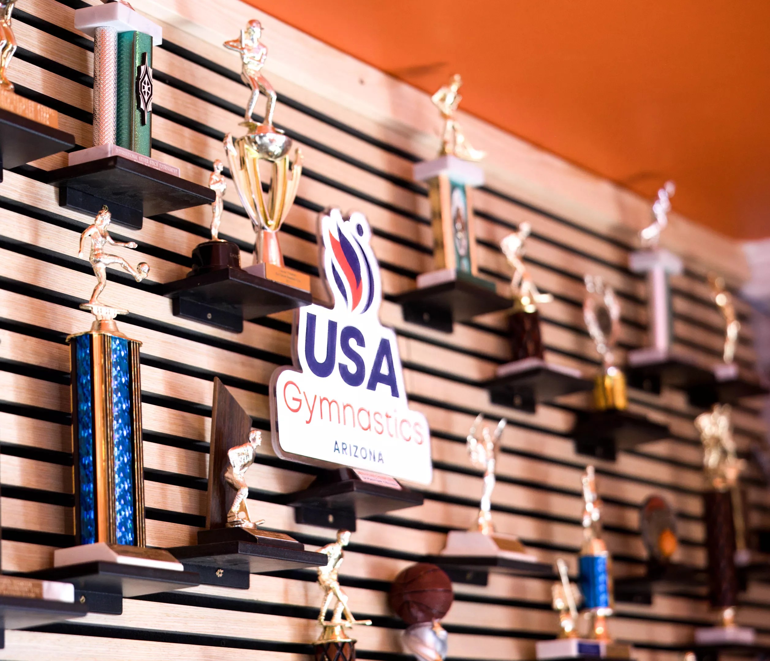 The entrance features a wall covered in sports trophies and medals of all disciplines, donated by customers.