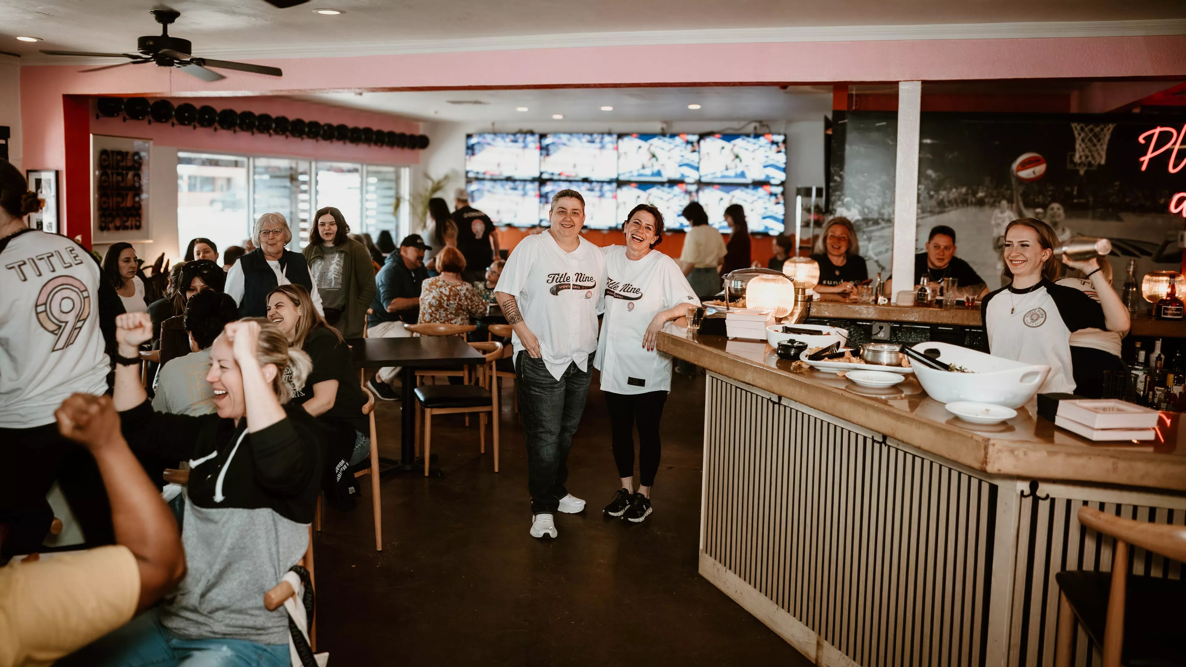 That wall quickly becomes the backdrop for several photos, including with the owners. You can spot Moore by her wide smile and short, curly hair pulled back in pigtails. Corley is the gregarious bar maven with arm tattoos flashing against her crisp white jersey. Between snaps, the two are constantly in motion, flitting around the bustling dining area and patio. Well-wishers offer hugs and gifts, like a basketball etched with the tavern’s logo.