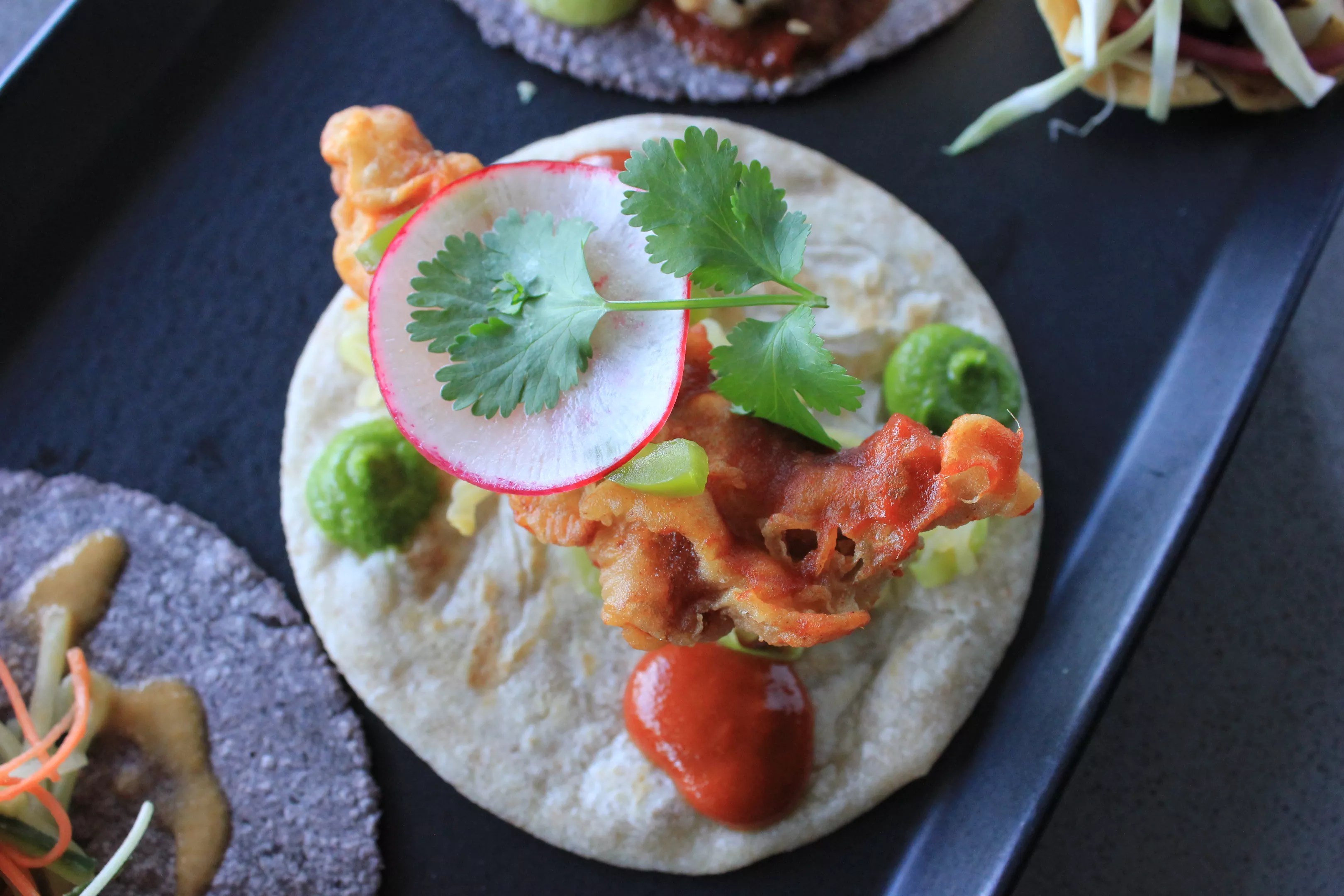 Shrimp with green curry on an heirloom blue corn tortilla.