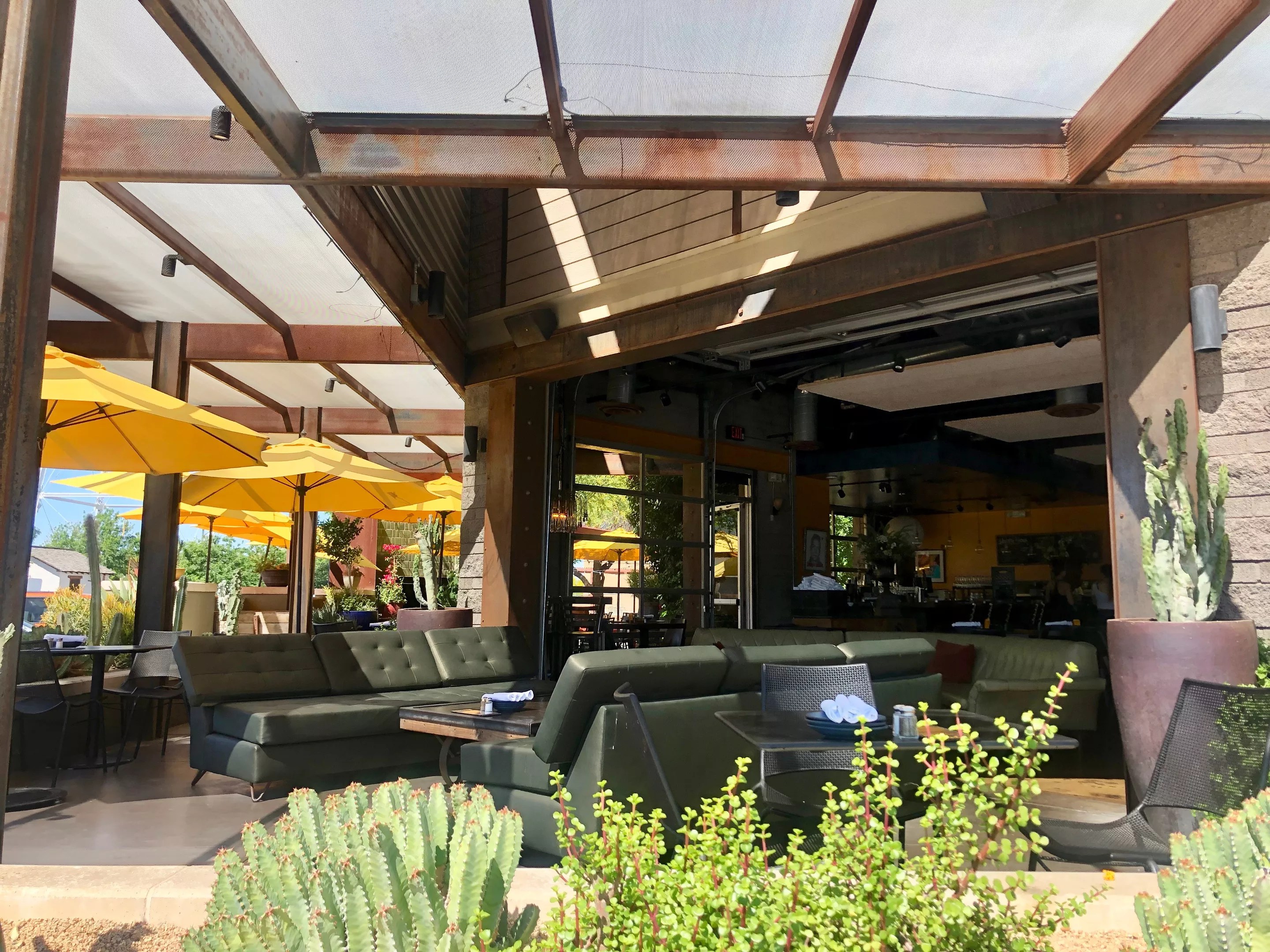 One of the liveliest patios in north-central Phoenix belongs to The Orchard – a two-acre food and drink compound located on-site at one of the city’s first citrus farms. The groves may be gone, but owners Ken and Lucia Schnitzer have preserved many of the original homestead’s signature features, like the historic water tower. There are plenty of options for food and drink, including Pomelo and Luci’s at The Orchard. The pet-friendly venue is also home to Splurge, a gelato and candy shop, and the Filling Station, dispensing cocktails and beer on tap. All restaurants share a courtyard with patios and picnic tables, a splash pad for the kids, and shaded lounge areas for the pups.