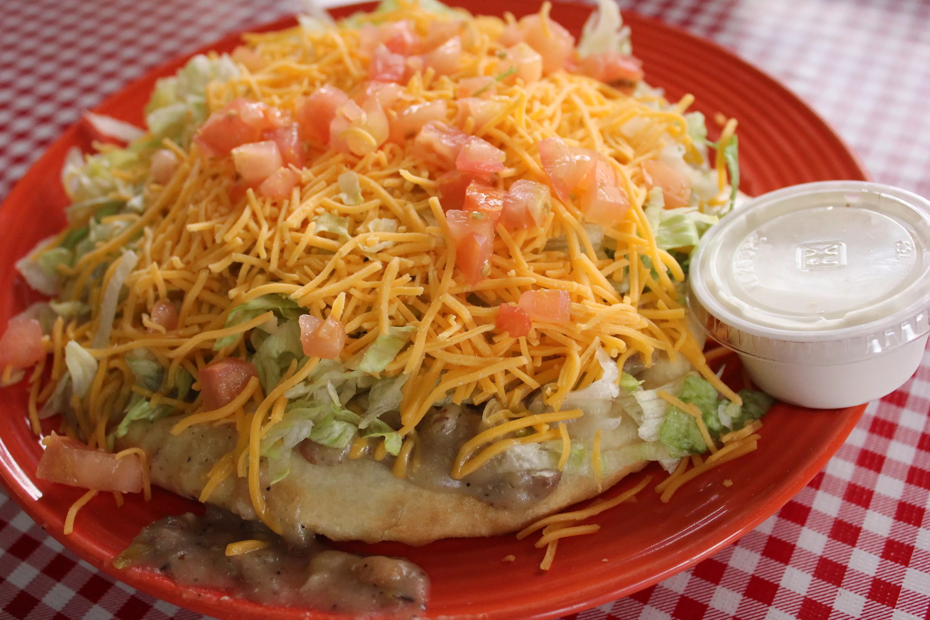 Rehab Burger Therapy Fry bread heaped with cheese and green chile at Maria’s Fry Bread and Mexican Food. Chris Malloy