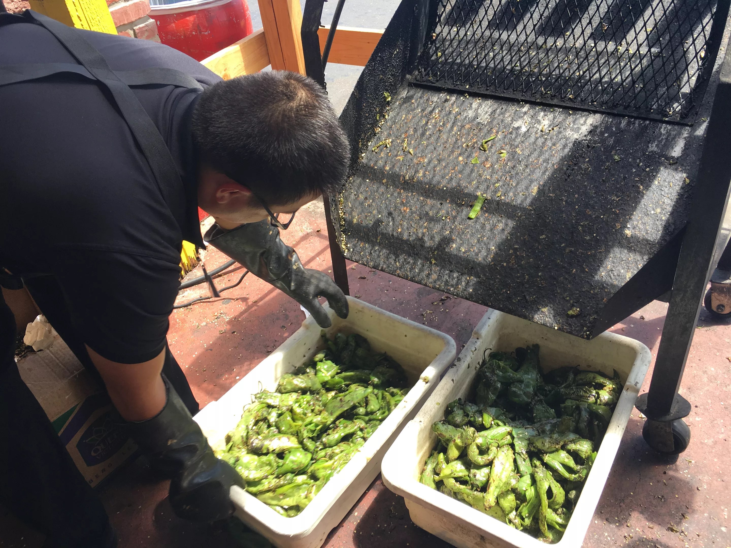 The roaster emits a mechanical whinny, causing the head of people in the parking to turn. For two or three minutes, the roaster gathers heat. Once it has topped out at full blaze, the peppers start to pop like firecrackers. A deep vegetal smell emanates. You can feel a curious tingle in the air. Pimentel says that, by day’s end, he often “feels like his skin’s on fire.”