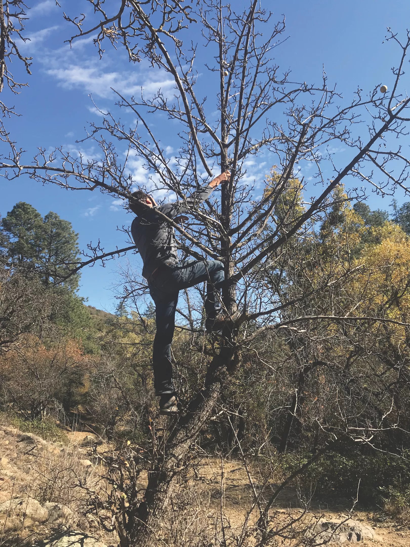 Kanin Routson climbs a feral pear tree to pick and assay fruit for perry-making potential.