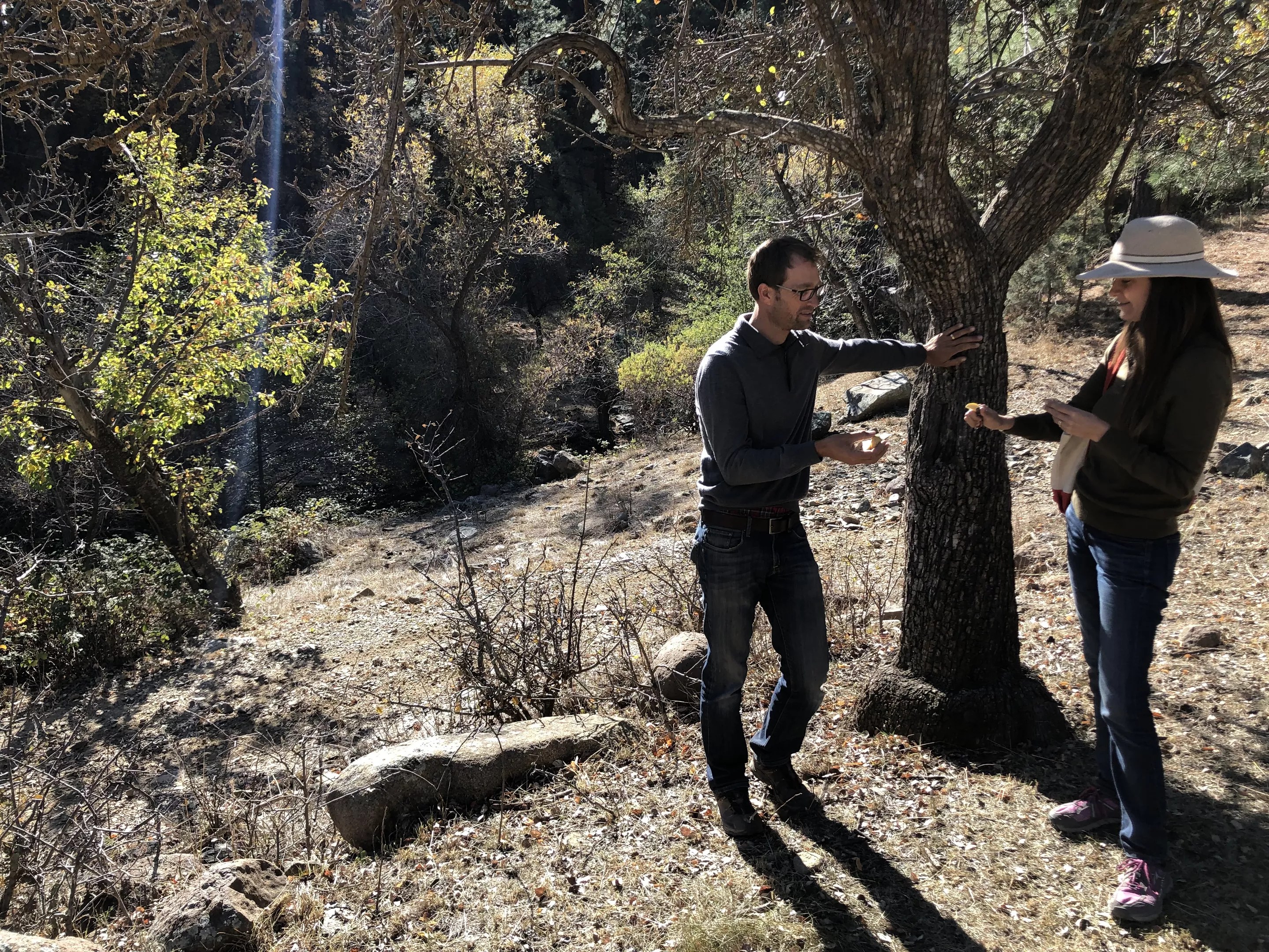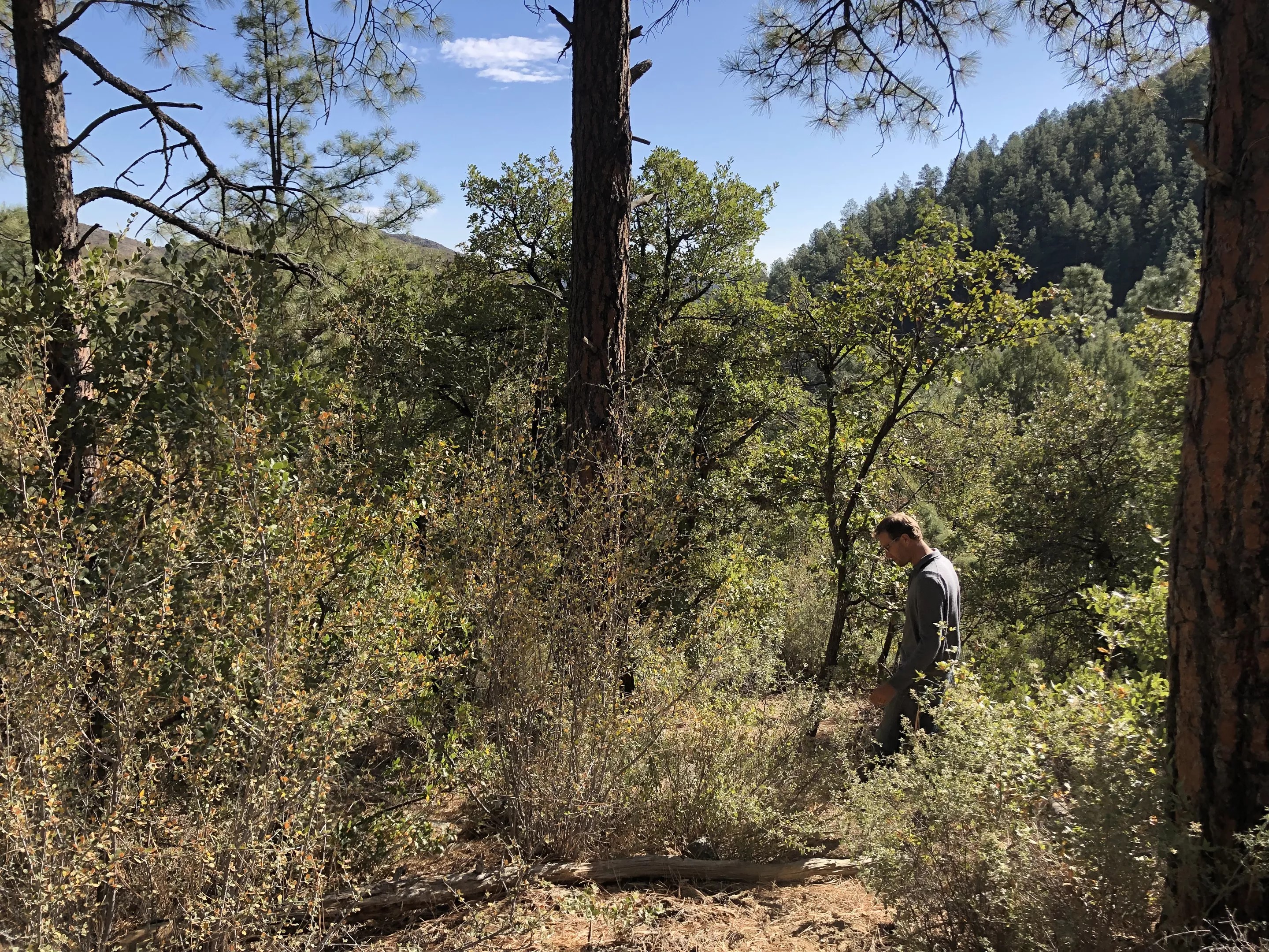 Kanin parks on the side of the powdery grade. Tierney grabs a Nalgene, puts on a straw hat. The two scientists start hiking downhill through pines, on a mission as immersed in the open world as the one they met on in 2012 – back when they were clipping forage on the Navajo Nation to help extrapolate grazing rates for the tribe and Bureau of Indian Affairs. Kanin twists his tall frame through scratchy brush with ease, with unconscious familiarity, having grown up on a dairy farm to the north encircled by similar woods. Ahead, his lean figure presses through, still lecturing, squinting in wiry glasses against the cool sun. Brambles whip as we squeeze past. The air is sharp and clear out over the treed valley we are entering.