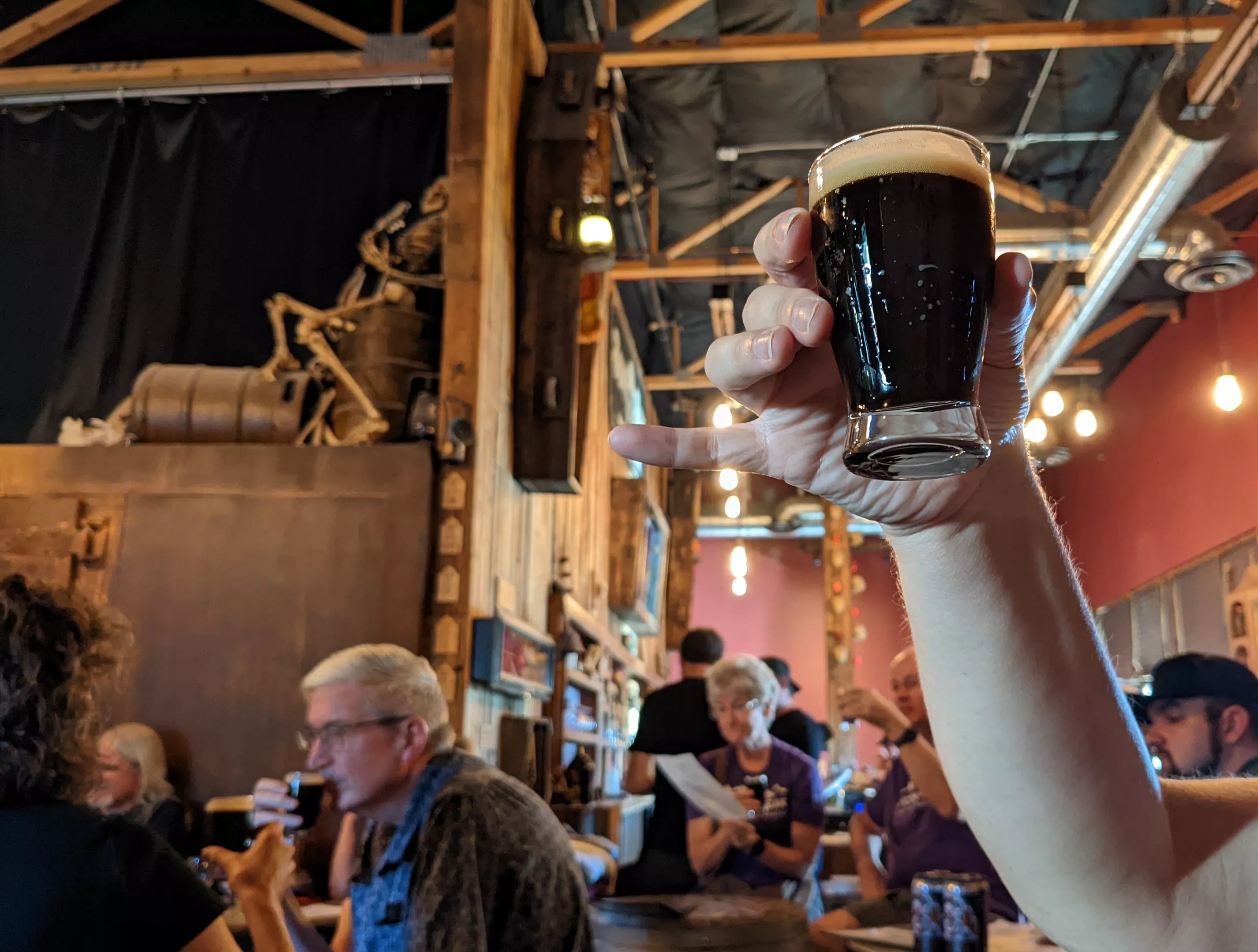 It’s the fourth and last taster. It’s a rich, dark stout called Pistols of Roulette. The bulk of the taproom quiets down and holds their beers out, studying the opacity.