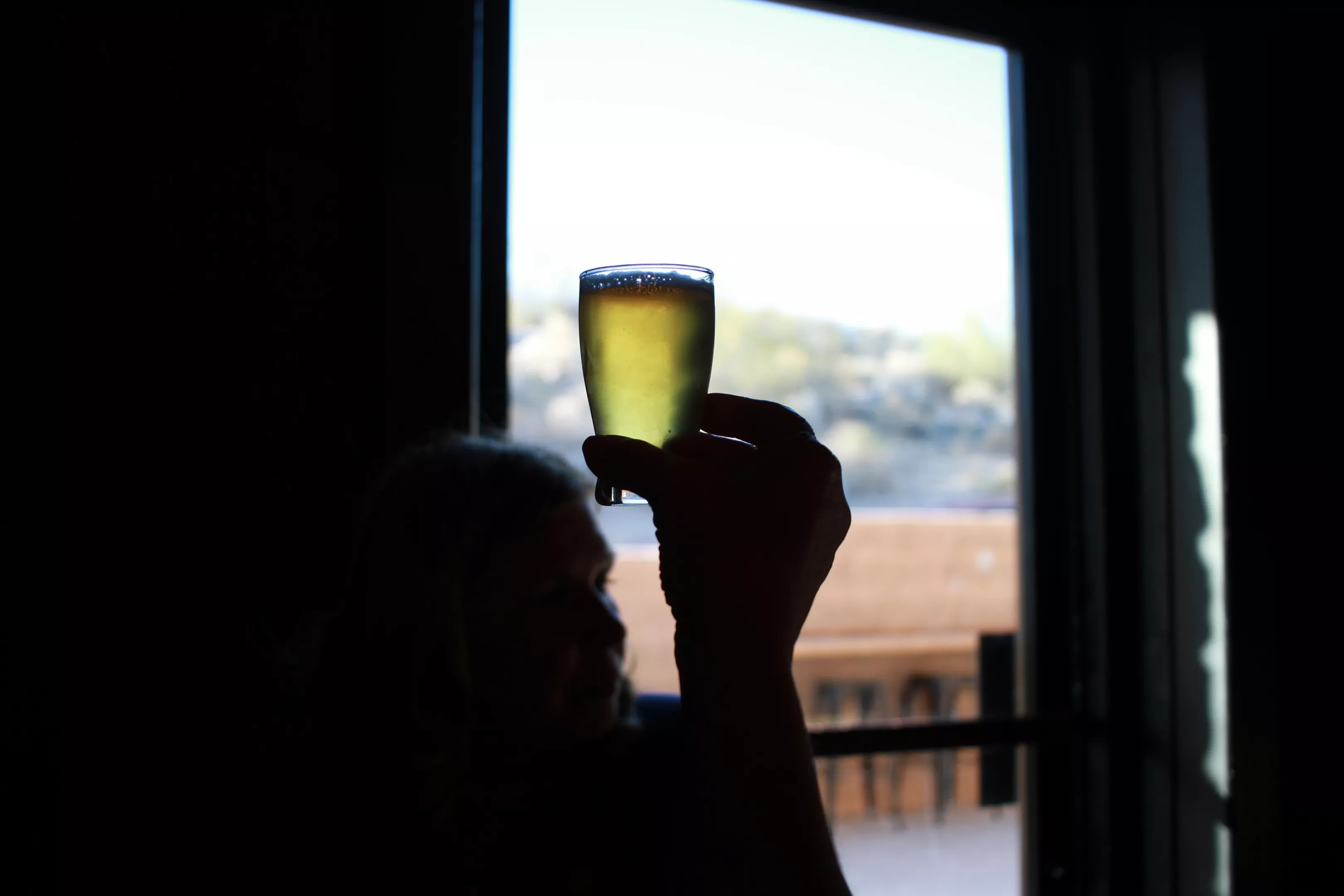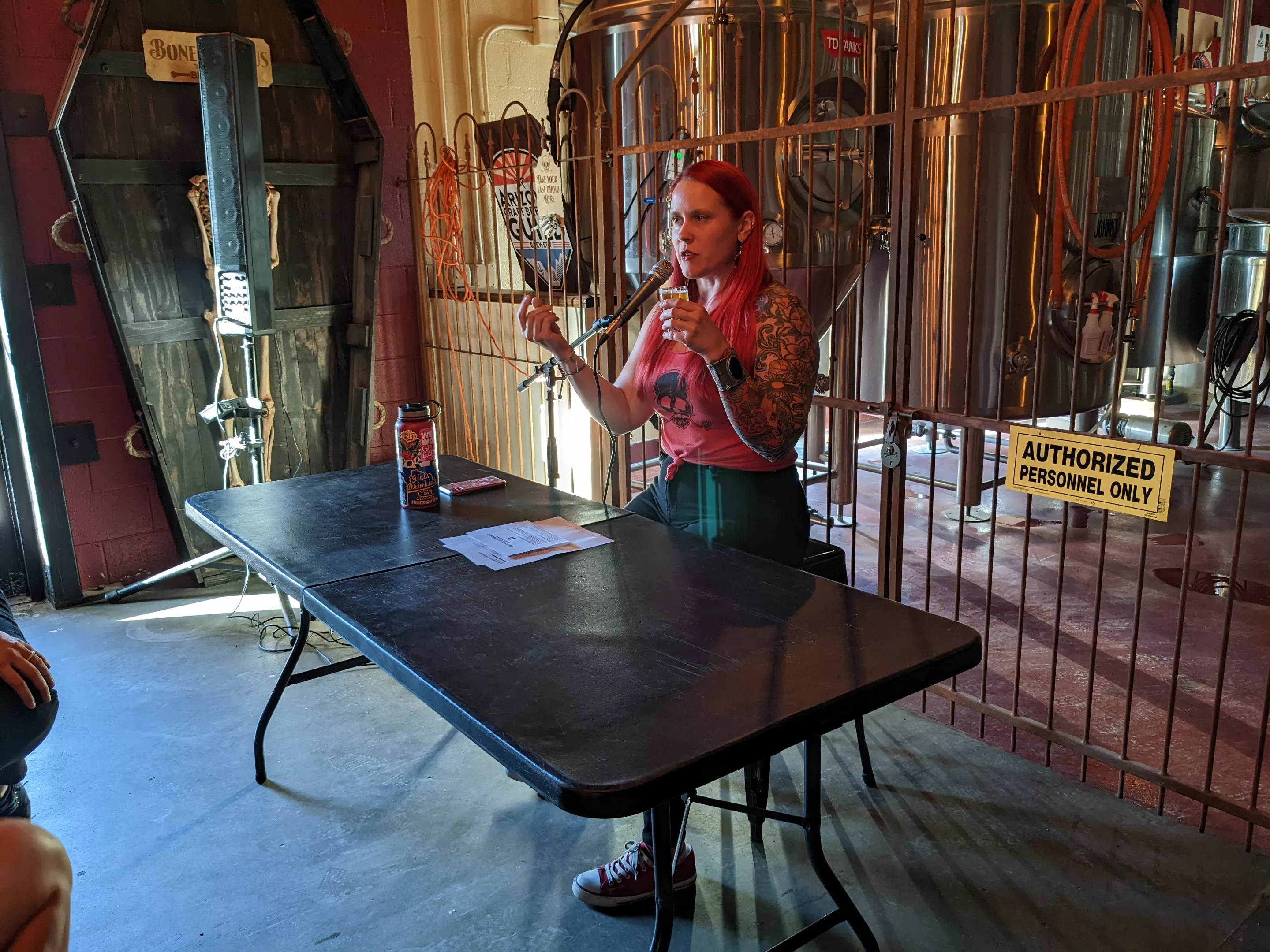 It’s the second Tuesday of the month, and Bone Haus Brewing in Fountain Hills is packed. The brewery’s owners are bringing in stools from outside and rearranging barrel tables to fit everyone in. Everyone’s trying to see a table by the tanks where a woman with bright red hair is set up with a microphone.