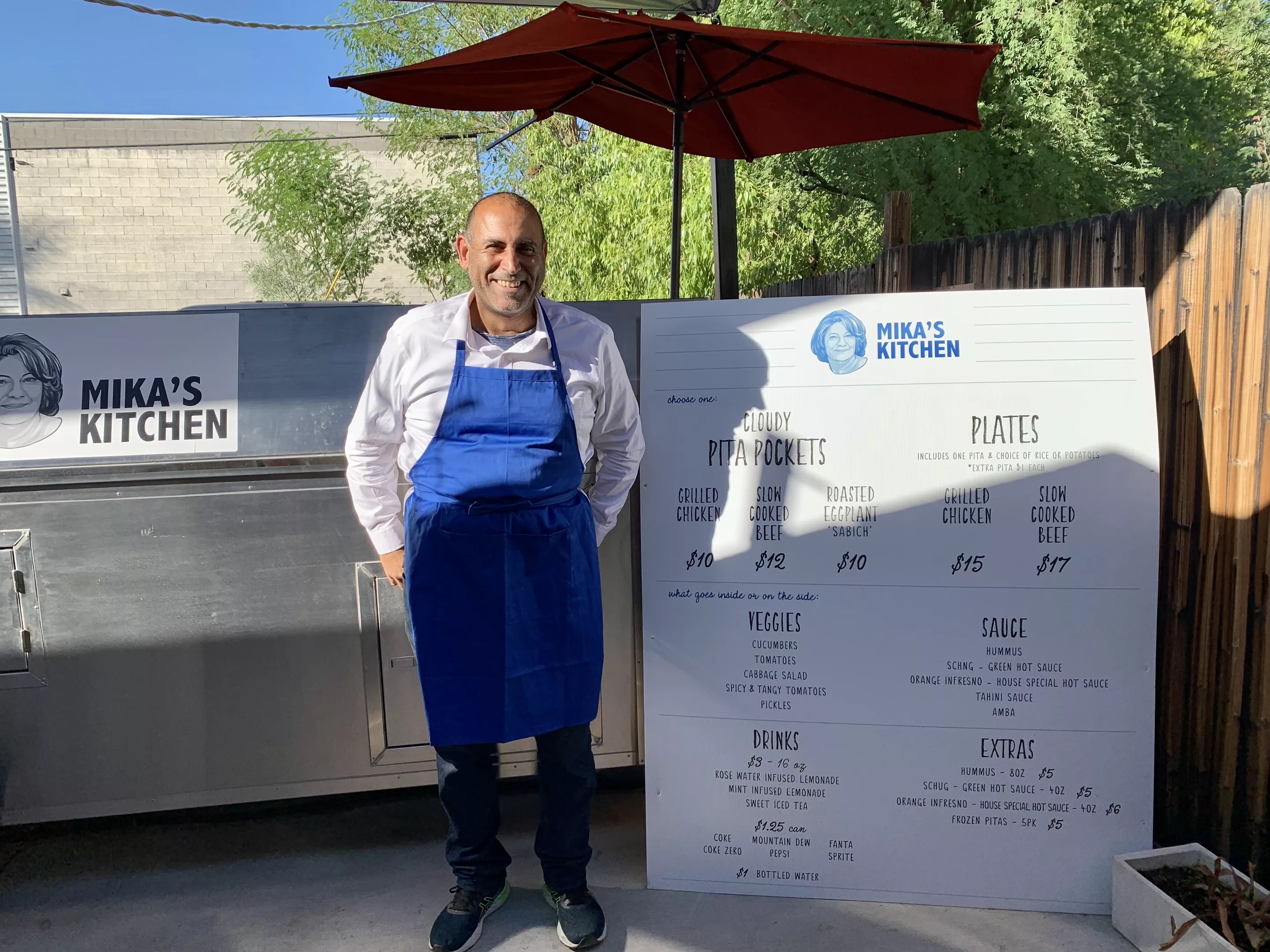 Netanel “Nate” Harat stands in front of his custom-built food cart at Mika’s Kitchen.