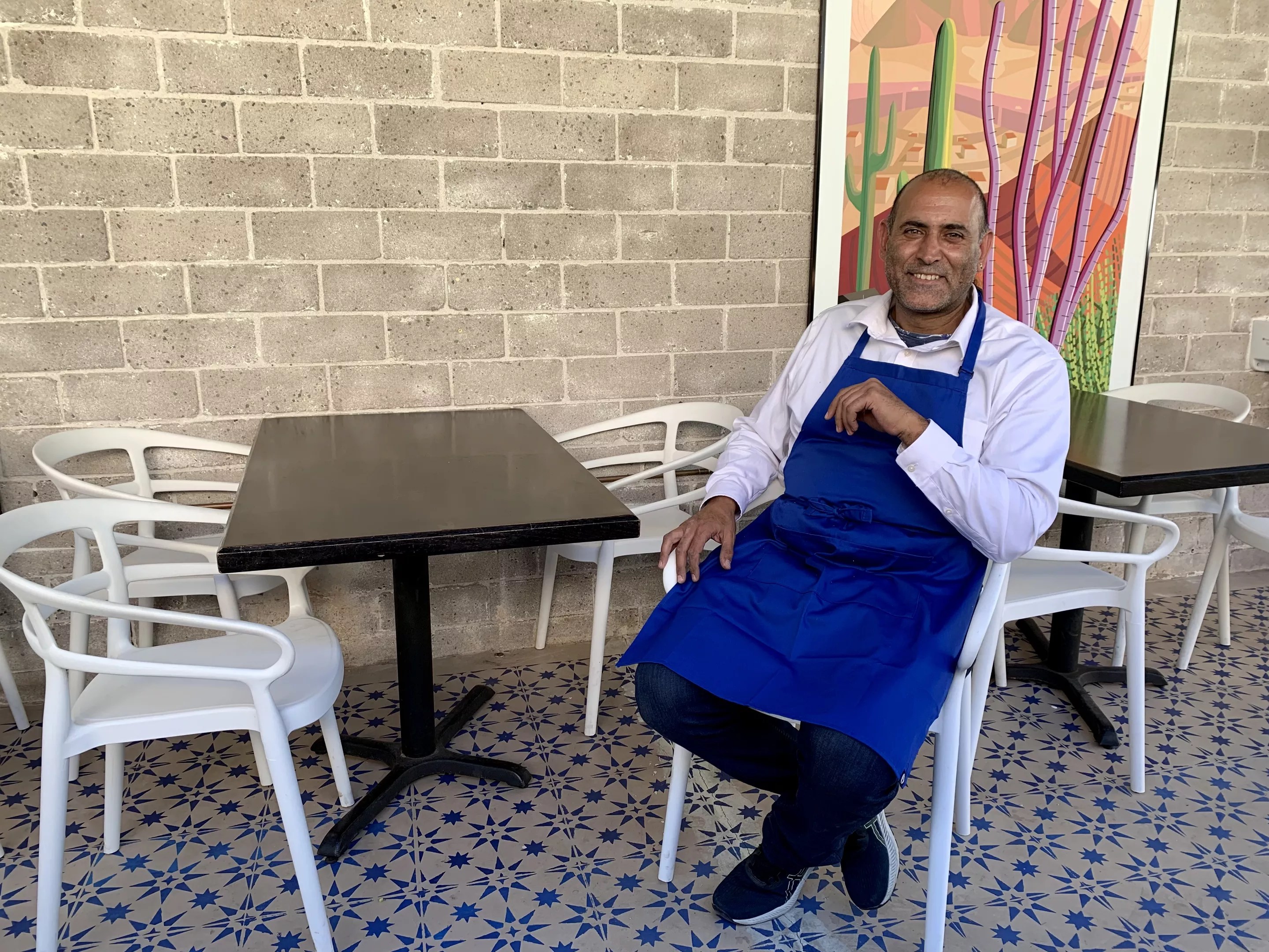 Now, that jungle has been transformed into a shaded patio oasis. A row of tables with white plastic chairs lines a patterned concrete floor. Colorful paintings depict scenes of Arizona. At the back of the narrow space, a shining stainless steel cart wafts rich aromas into the air.