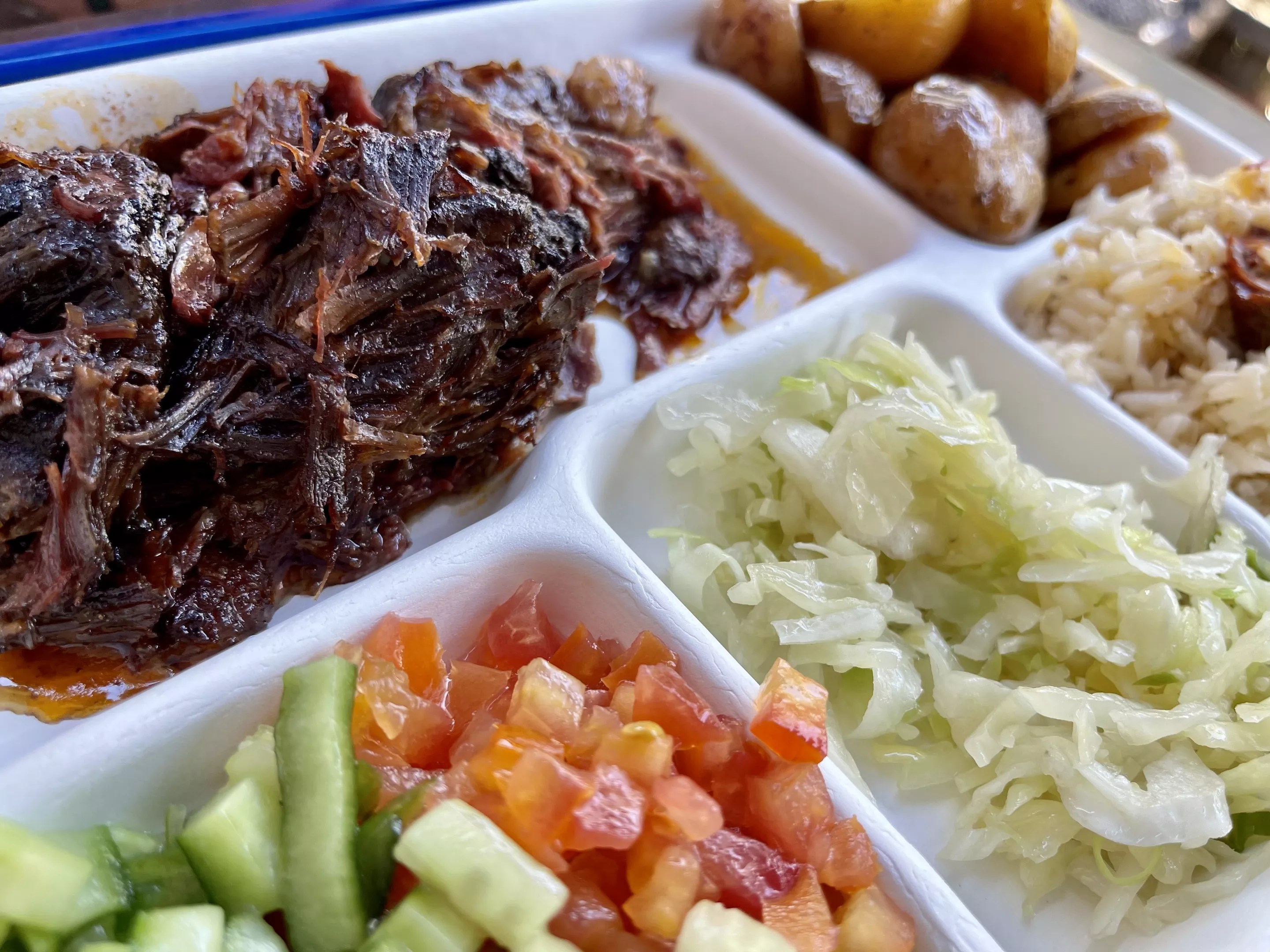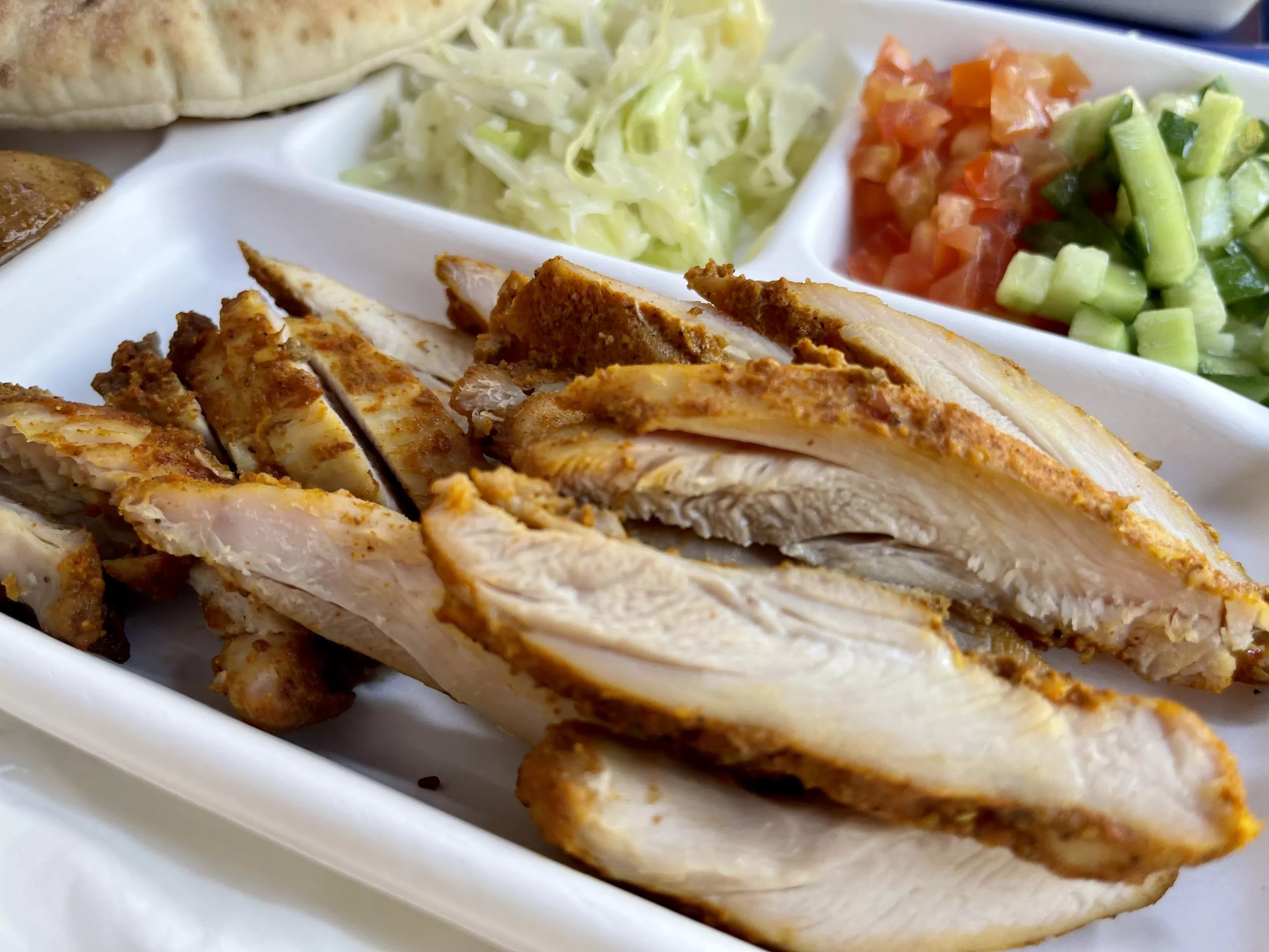 From that cart, Harat serves a small menu with big flavor. He describes the options as “Israeli street food.” There’s rich, dark, beef that he slow-cooks overnight, grilled chicken, which starts marinating in a fragrant spice rub the night before, and sabich, a pita stuffed with roasted eggplant and hard-boiled eggs that Hatal explains is “primarily tailored to the Israeli community.”