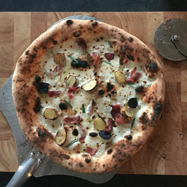 Myke Olsen’s white pie is a stand out on the menu this season: garlic cream, fresh mozzarella, bacon, potatoes, roasted onion, rosemary, and aged gouda.