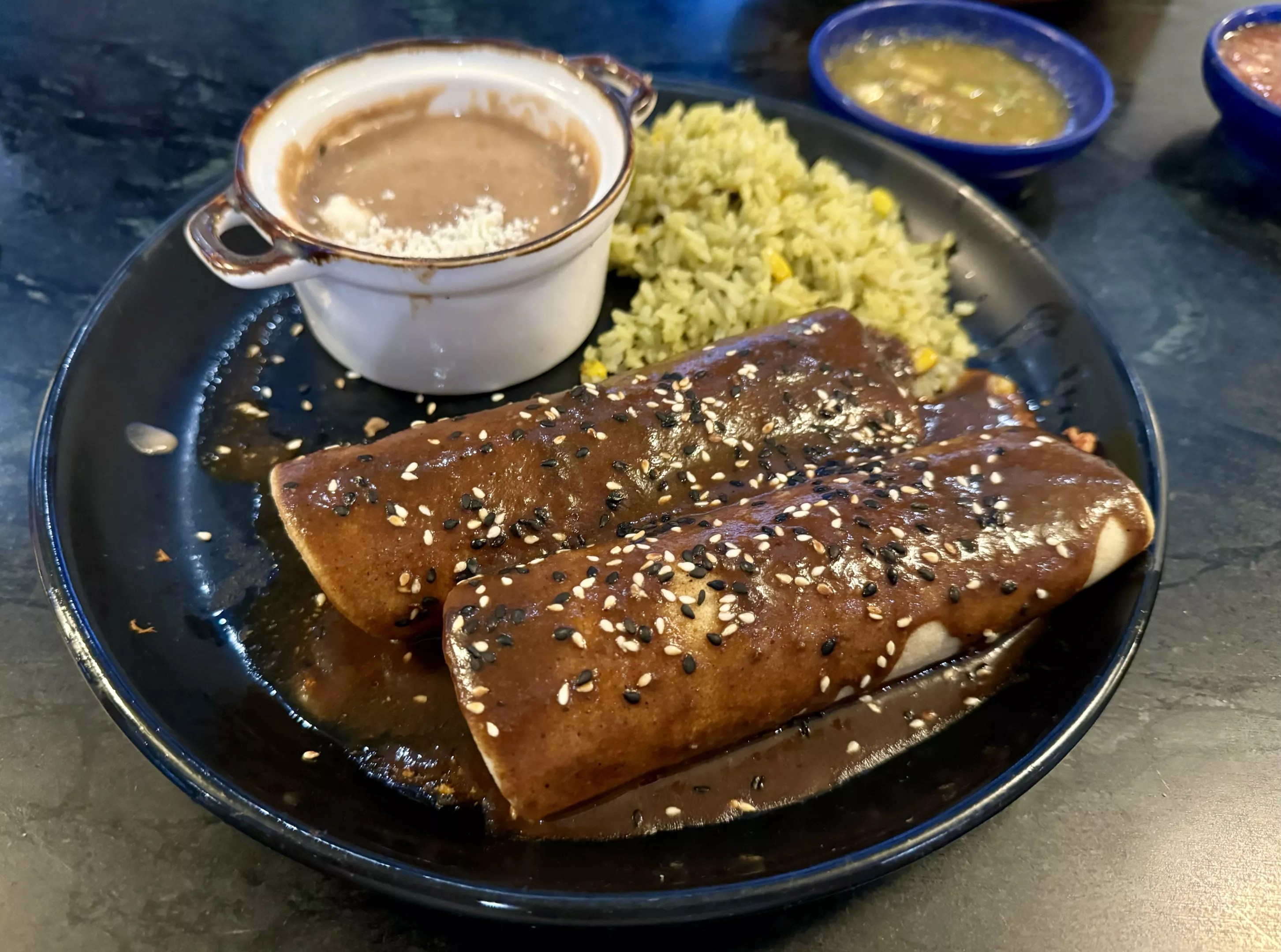 The chicken mole enchiladas are made with a Jalisco-style sauce which leans sweeter, with flavors of chocolate and caramel. While initially surprising, the mole was a craveable sauce that kept us coming back for more.