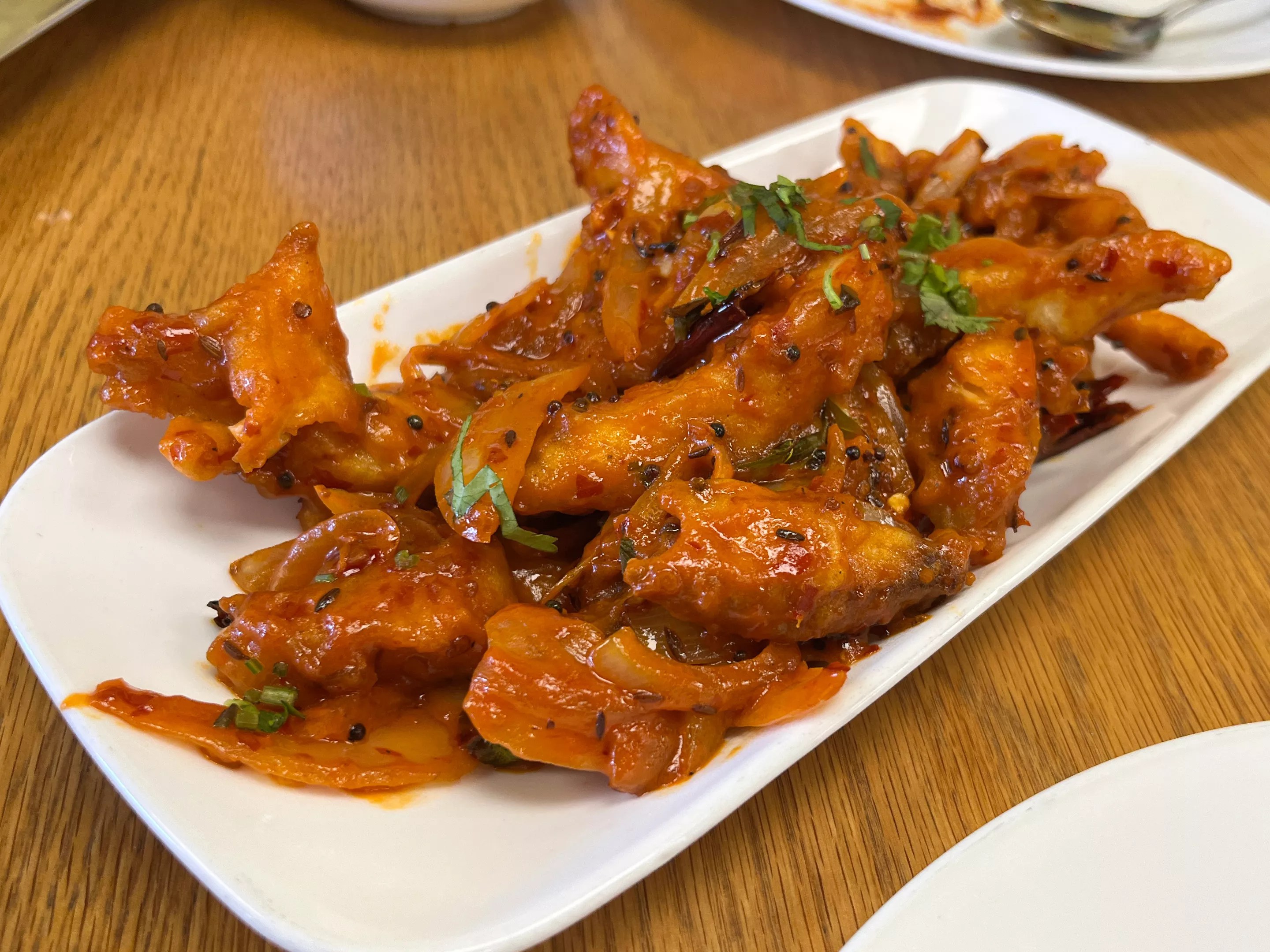 Chicken 555 takes fried nuggets of chicken and coats them with dry, garlicky fire.