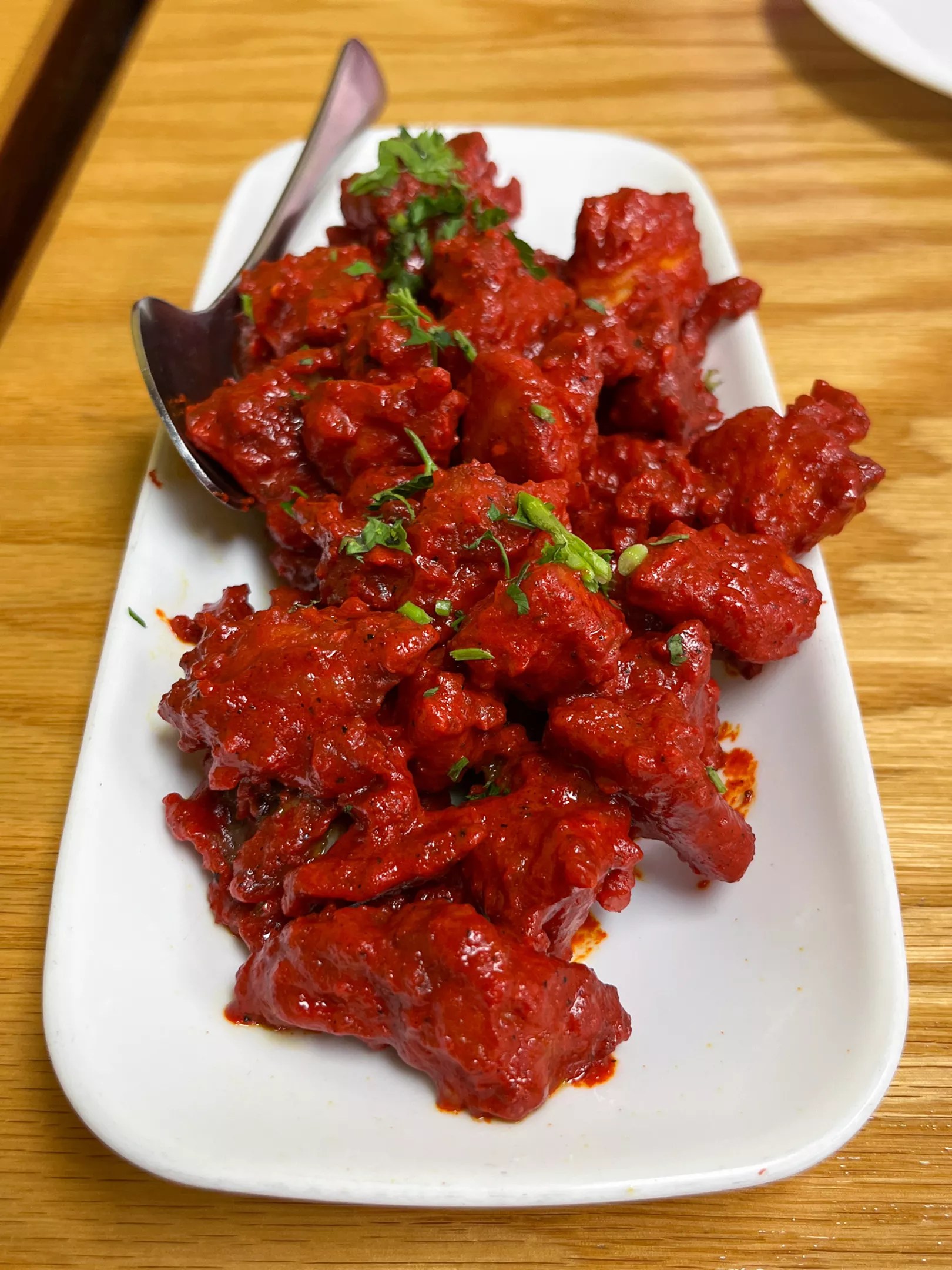 Fried starters excel, including Indo-Chinese dishes such as gobhi Manchurian – battered florets of cauliflower in a tangy sweet-and-spicy glaze reminiscent of good Canto-American cuisine – and Chicken 555, snacky little nuggets of fried chicken in a belligerent mix of chiles and garlic that bullies its way into your sinuses and takes up residence there.