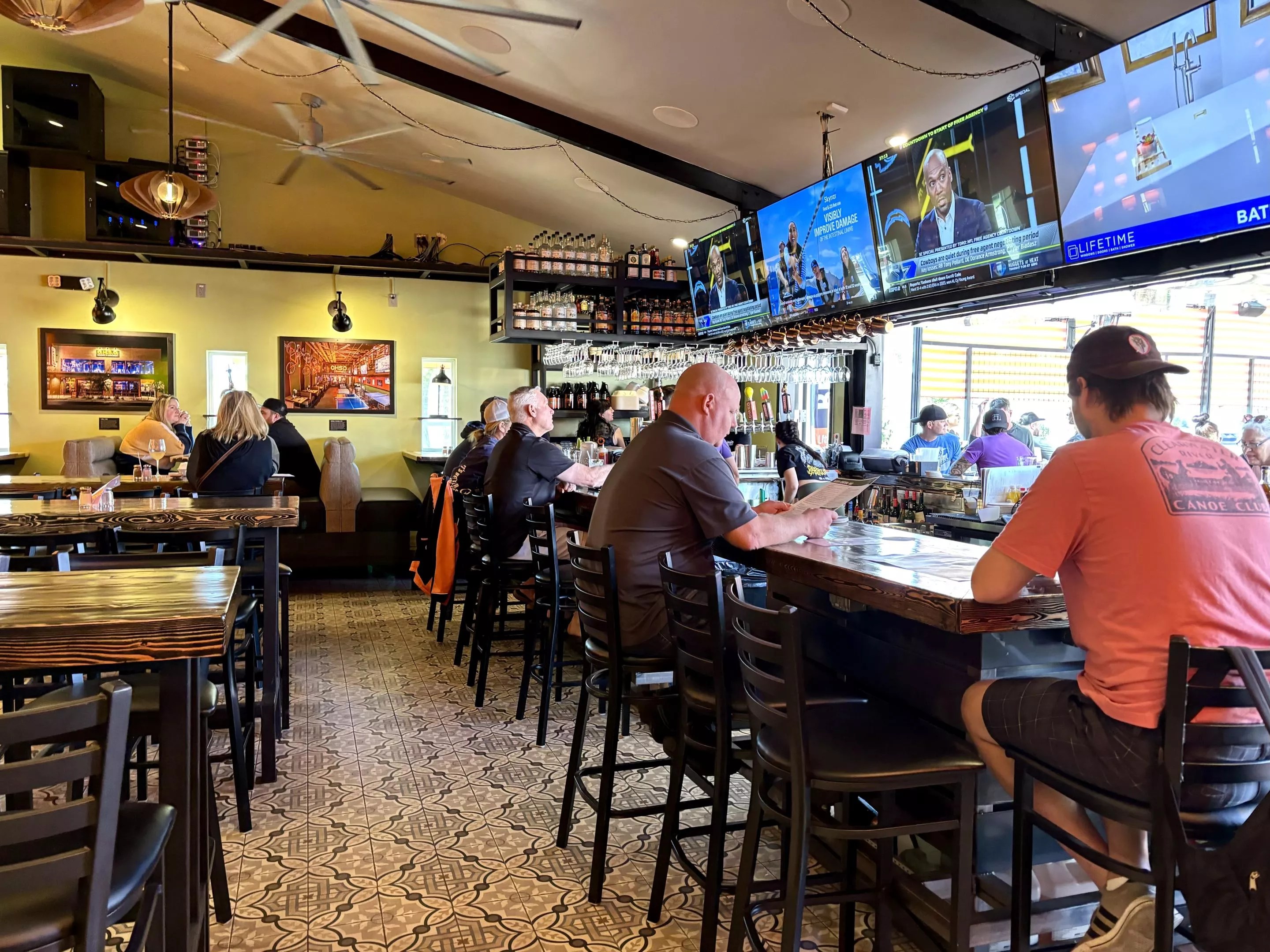 The interior seating area of O.H.S.O. is quite small, featuring a bar with plenty of TV screens to catch the game. The bar opens onto the large patio area.