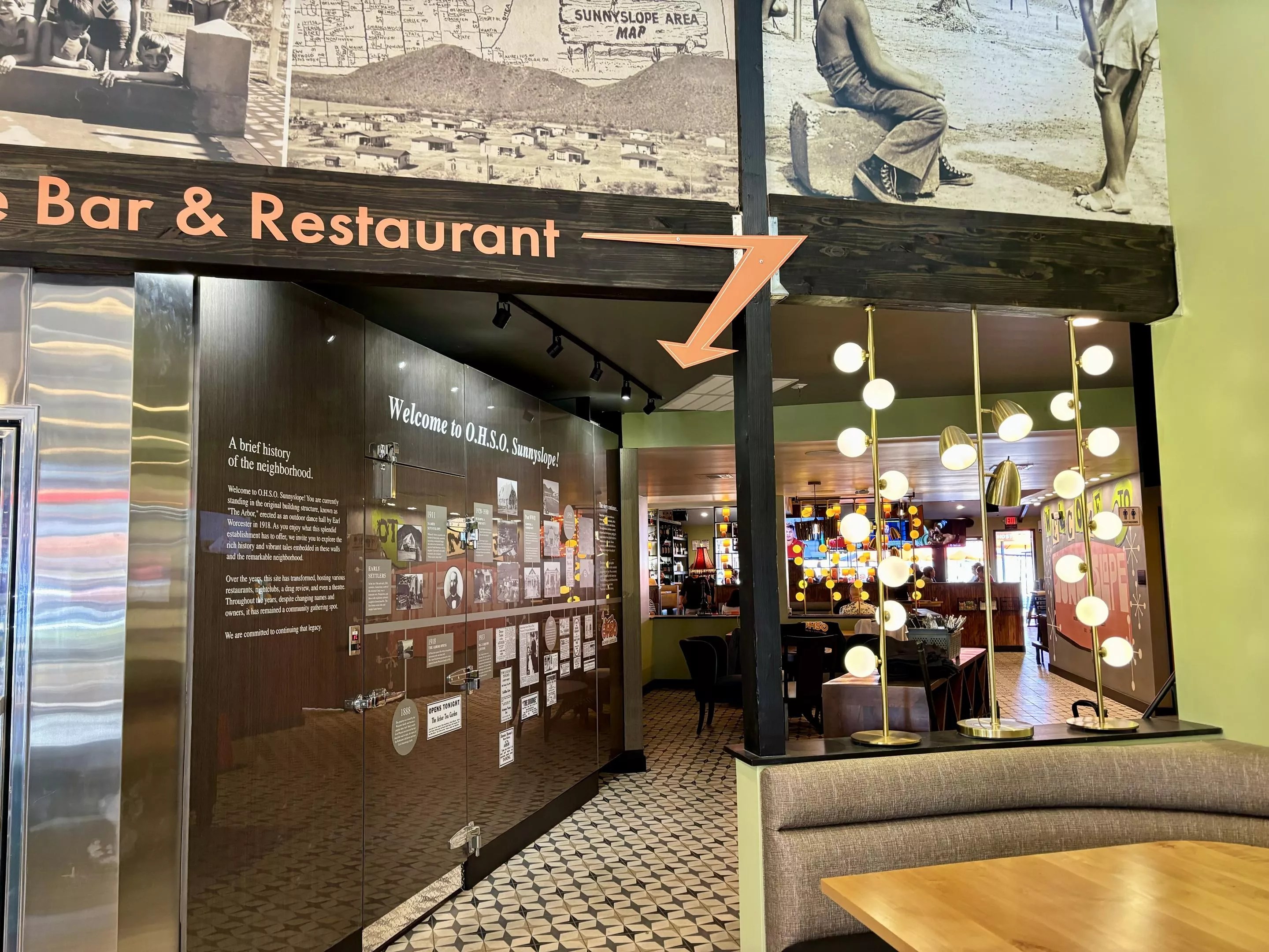 The history of the building and the Sunnyslope neighborhood is celebrated throughout the space, with small touches such as historical photographs on the walls, and on a grand scale with a floor-to-ceiling flow chart explaining the story at the restaurant’s entrance.
