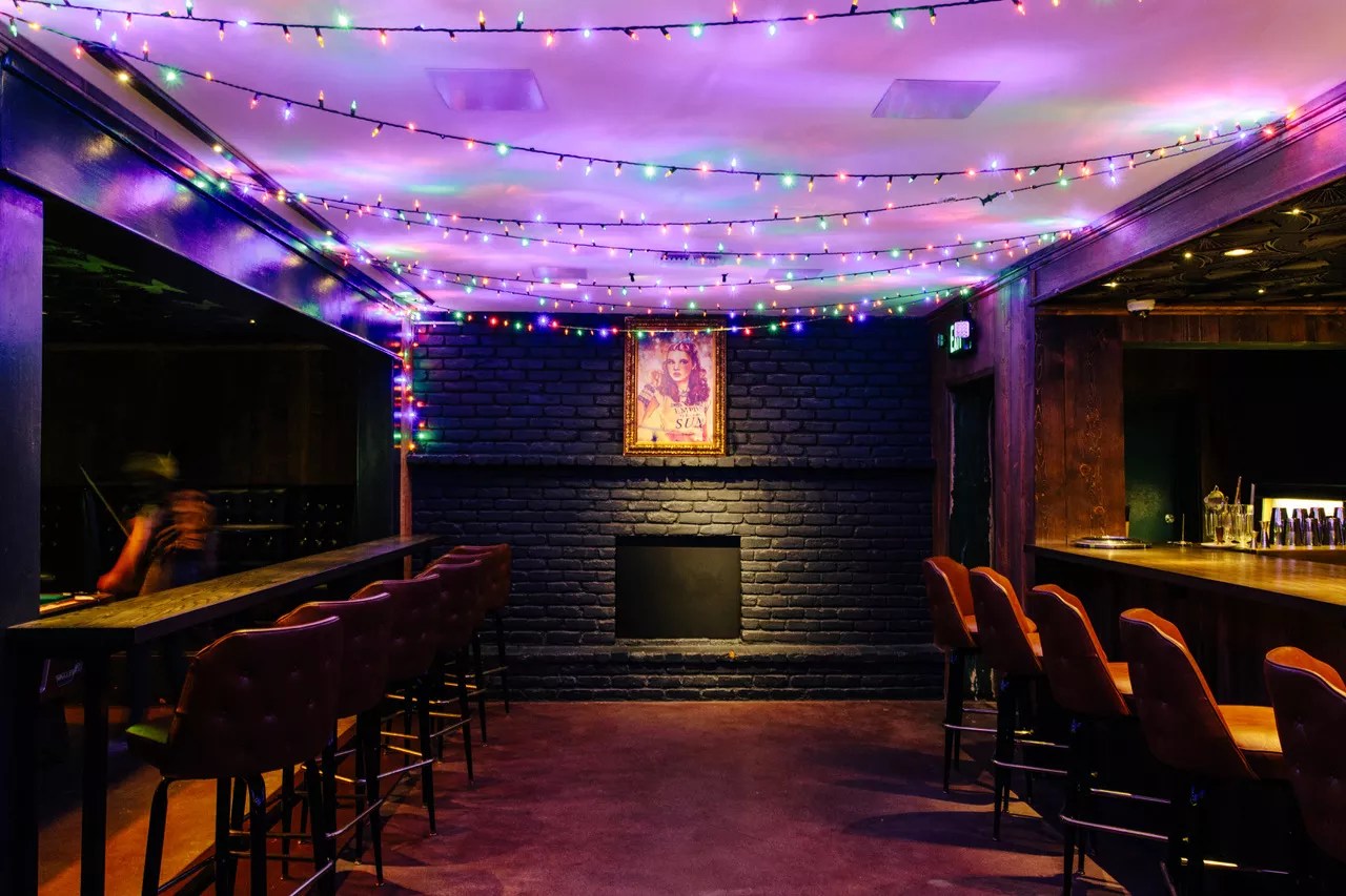 Inside, Sunny’s Lounge has a dimly-lit, dive bar atmosphere complete with pool tables, tufted seating, and string lights.