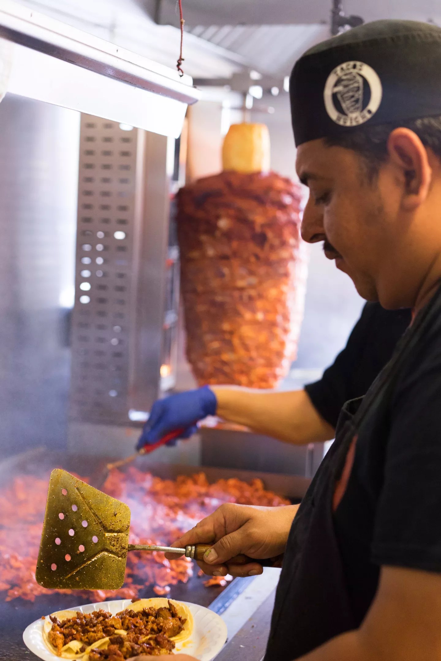 Mena carefully stacks the pork high in the prep sink. He’s been making al pastor since he was 12 years old, living in Cuernavaca, just south of Mexico City in the state of Morelos.