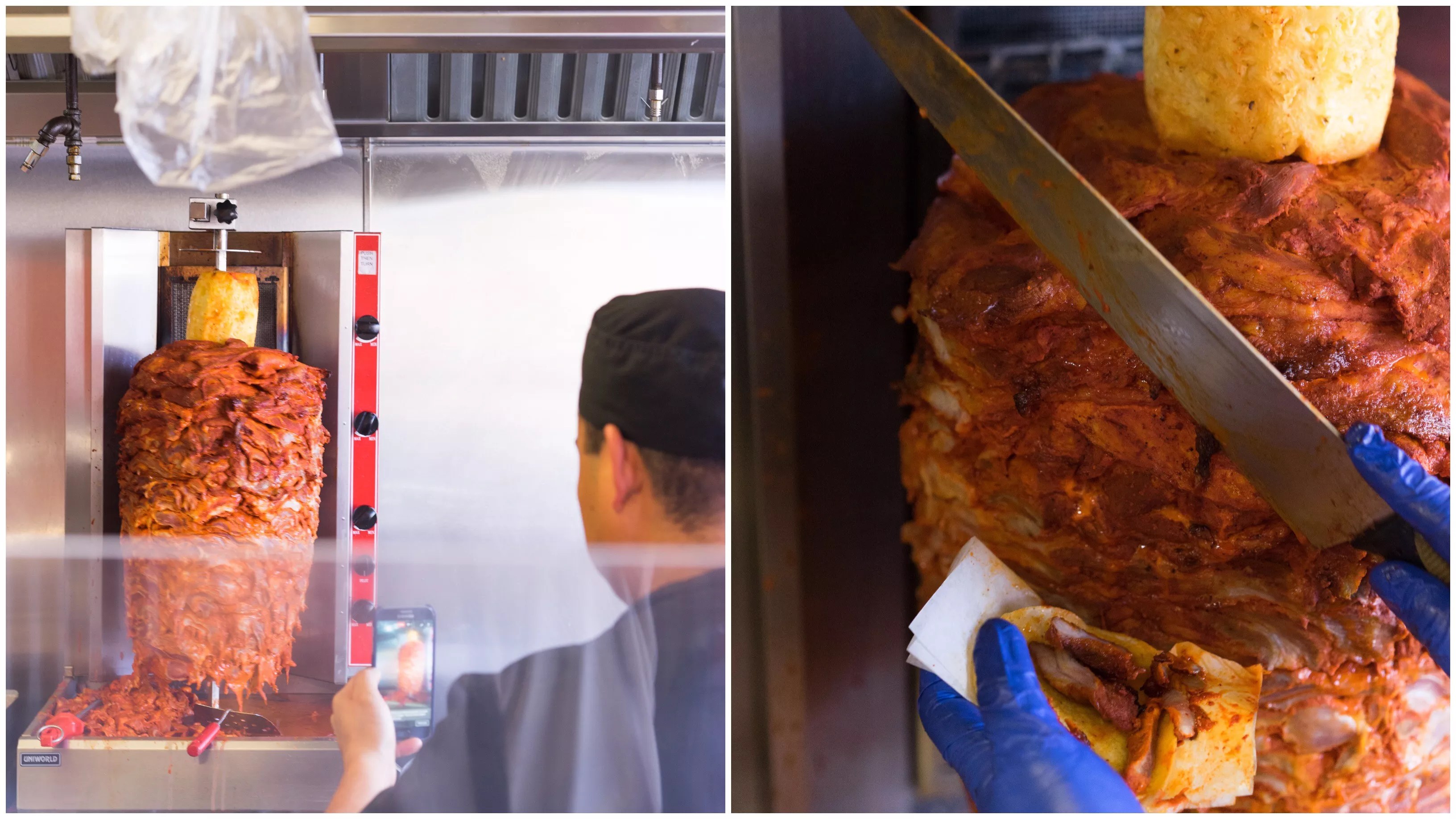 Left: Mena takes a photo of the loaded spit, which has just begun roasting. Right: Mena carves pork from the spit into a tortilla, which will be placed face down on the stovetop to finish cooking.