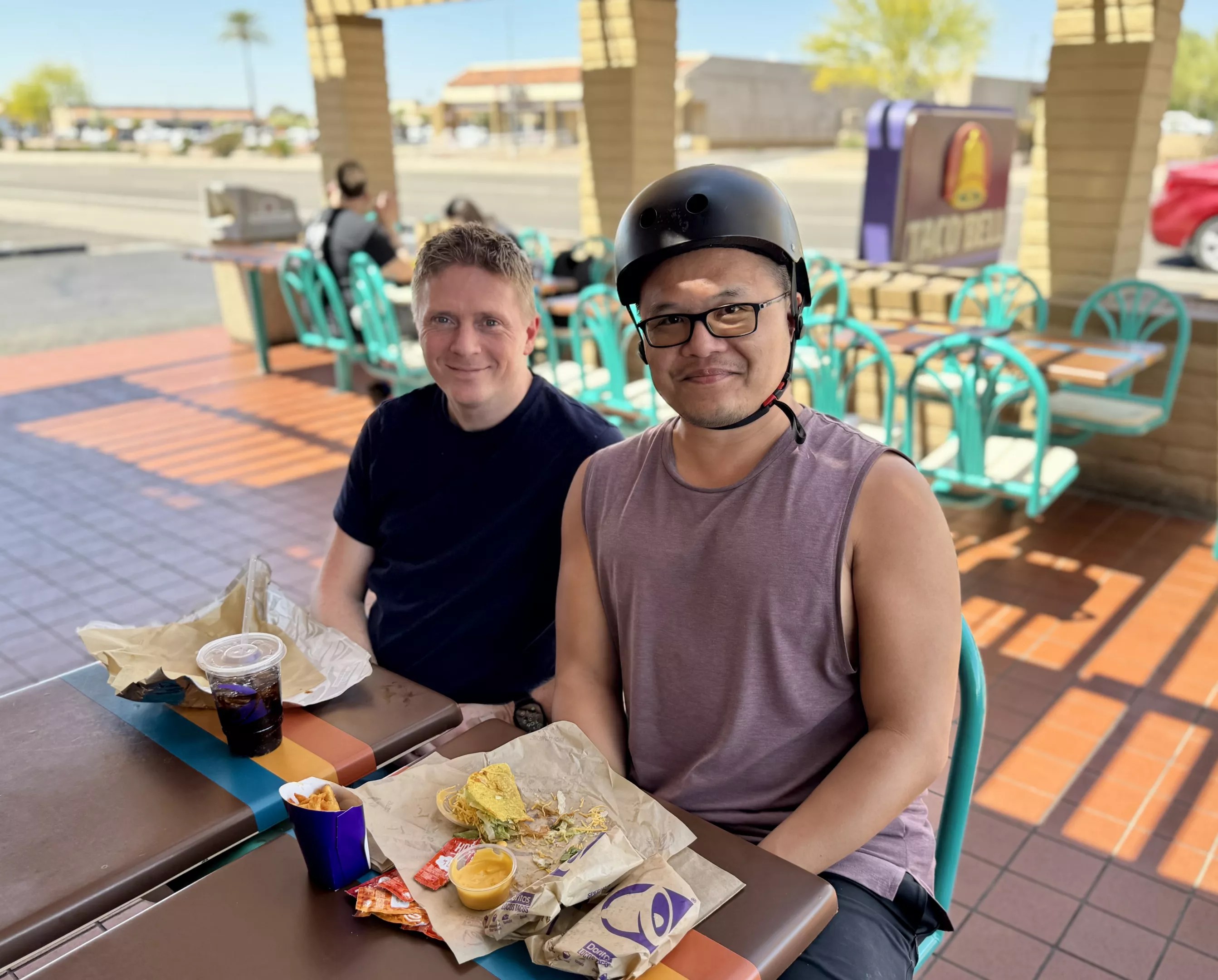 Andrew Spokes and Andrew Chi rode their electric bikes from their Scottsdale home to have lunch at the retro Taco Bell.