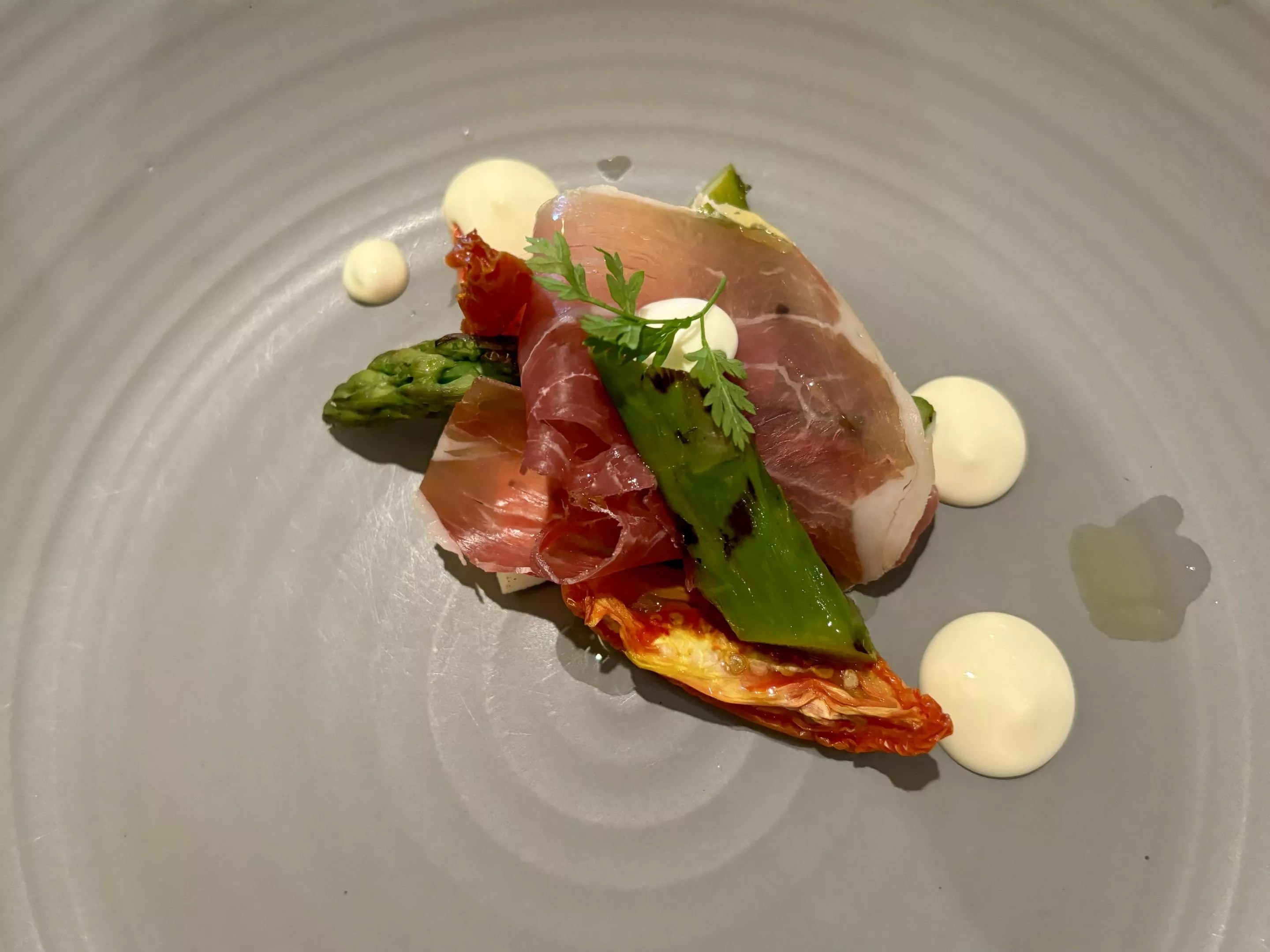 The grilled asparagus salad includes burrata, prosciutto, confit tomatoes and shallot aioli.